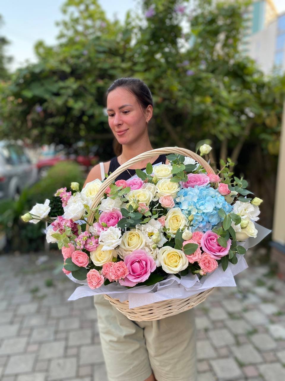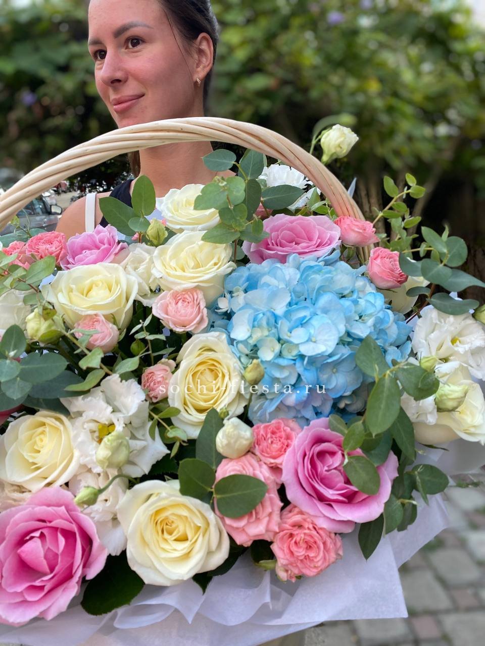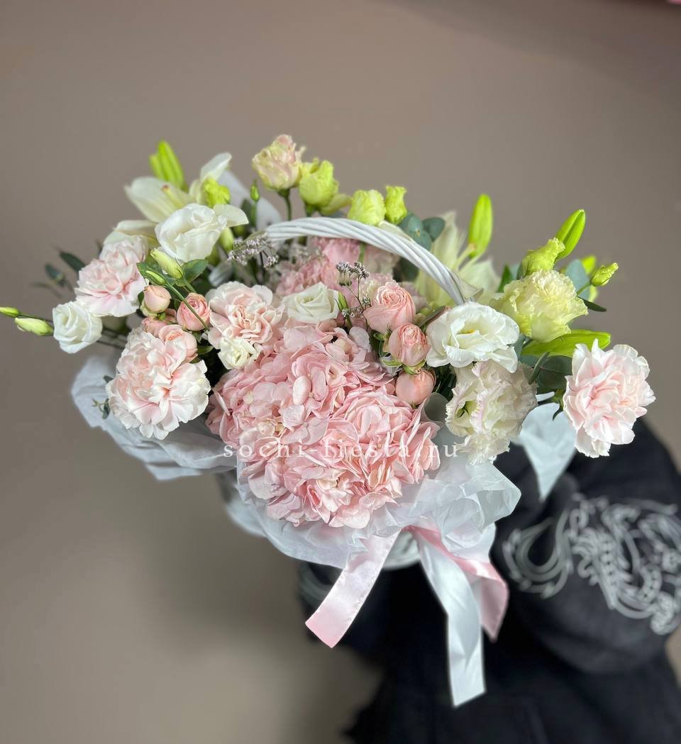 Цветочная корзина из пионов и пионовидных роз "Перфекте"