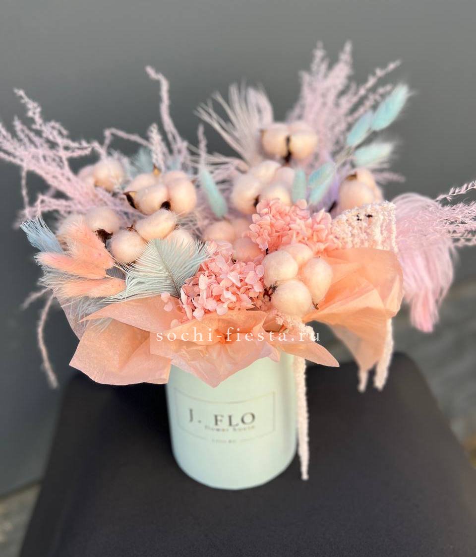 Маттиола и диантусы наполняют корзину летним ароматом. Кустовые розы чередуются с эустомой, создавая мягкий переход оттенков.