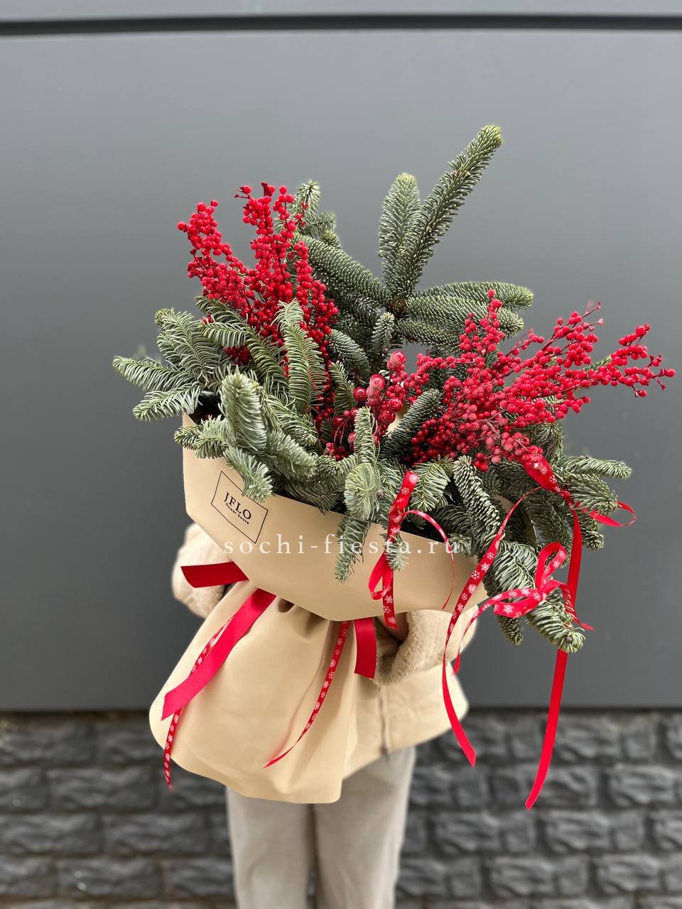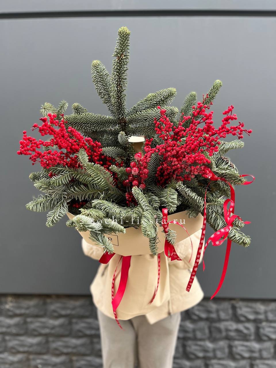 Живые ветви нобилиса переплетаются с красными ягодами илекса. Вертикальная сборка создаёт ритм между хвойной зеленью и ягодными гроздьями. Букет держит форму и долго сохраняет свежесть.