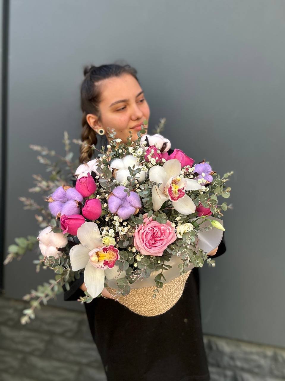орхидеи, розовые розы, эвкалипт, гипсофила, джут кашпо.
