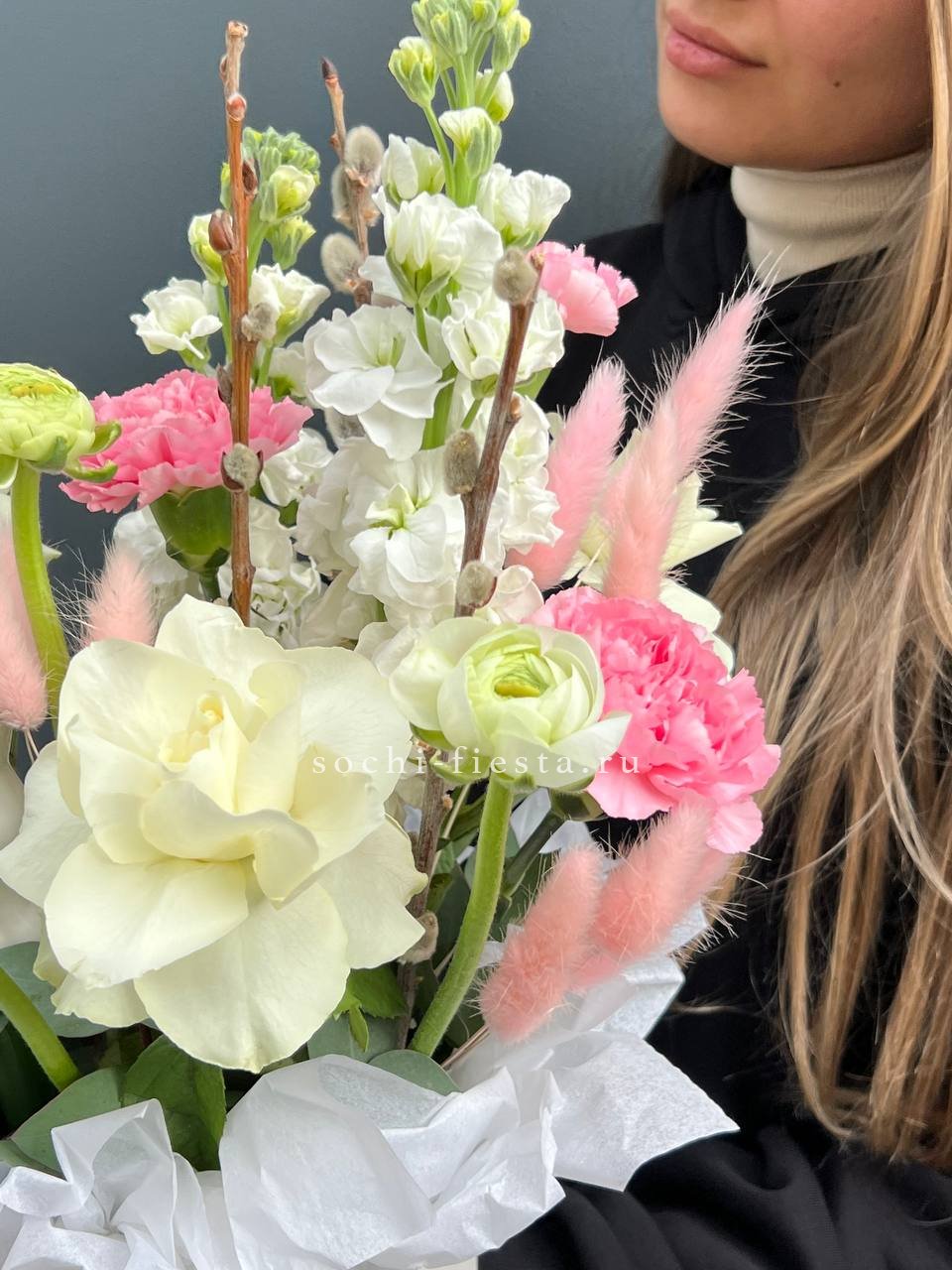 Белые розы образуют плотную основу композиции, а пушистые соцветия лагуруса и веточки вербы добавляют весеннюю лёгкость. Керамический кролик завершает образ и придаёт бокс у праздничное настроение.