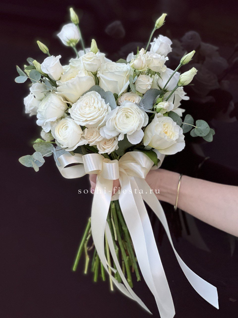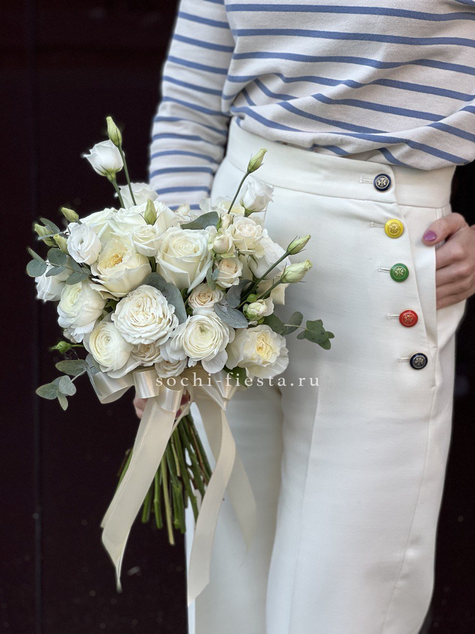 Кремовые и белые оттенки перетекают друг в друга, создавая мягкий переход без резких границ. Эвкалипт и дизайнерская упаковка завершают образ.