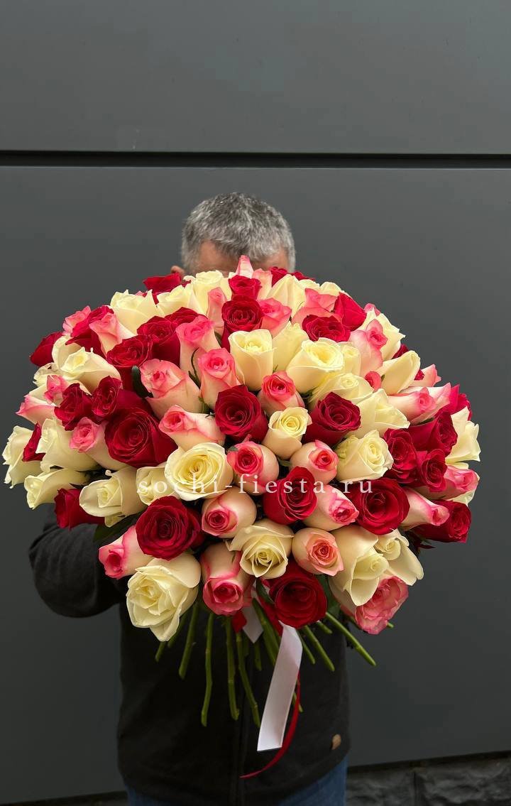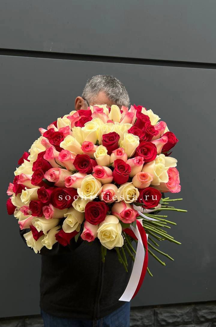 101 роза разноцветных оттенков, лента, упаковка на выбор.