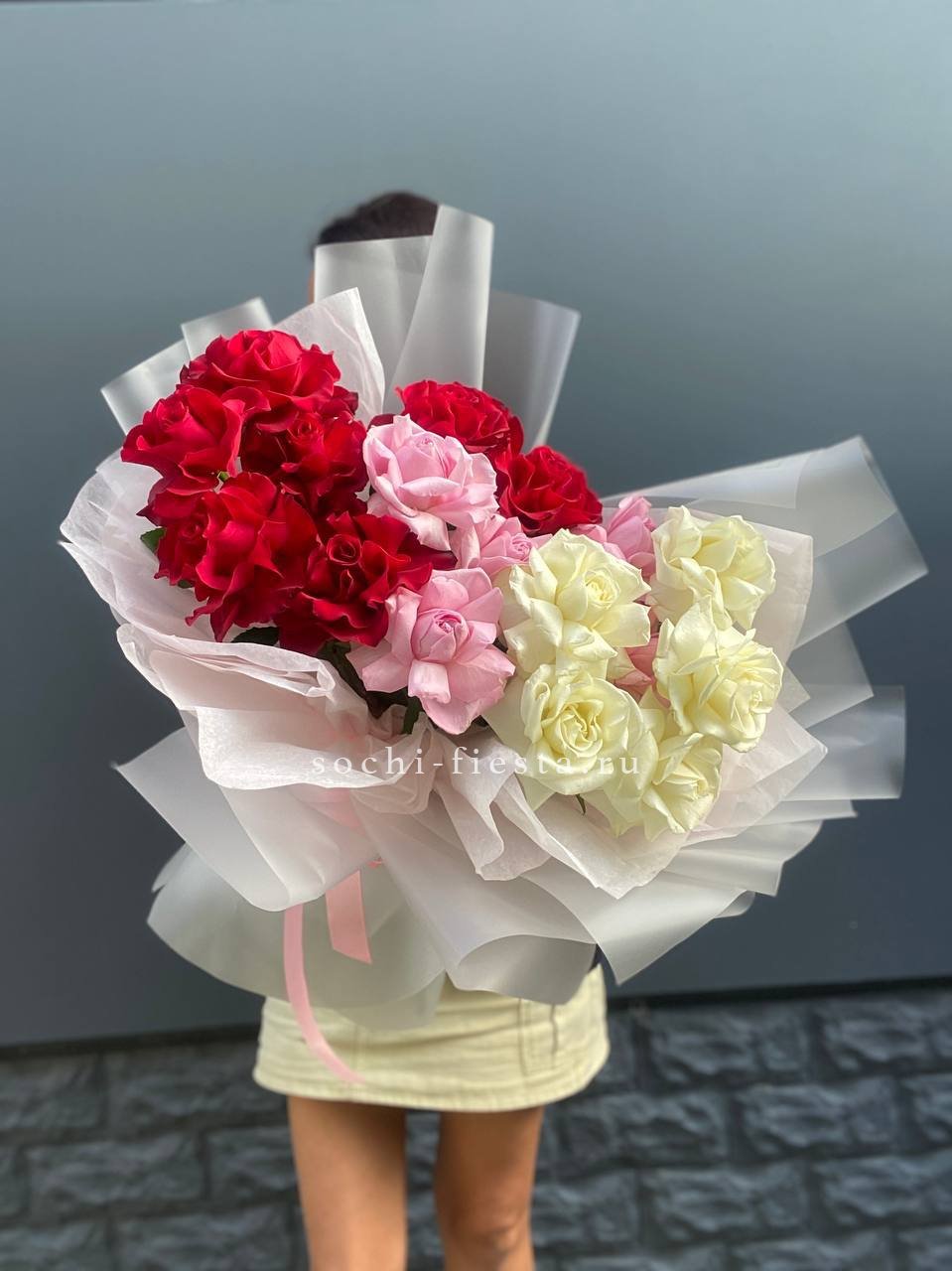 Пятьдесят пять роз переплетают белый и розовый в мягкую градацию без четких границ. Букет дышит светом и воздухом, а его объем позволяет рассмотреть каждый бутон отдельно.