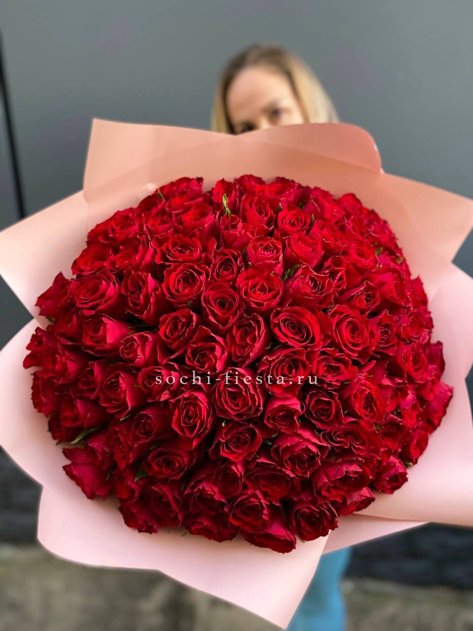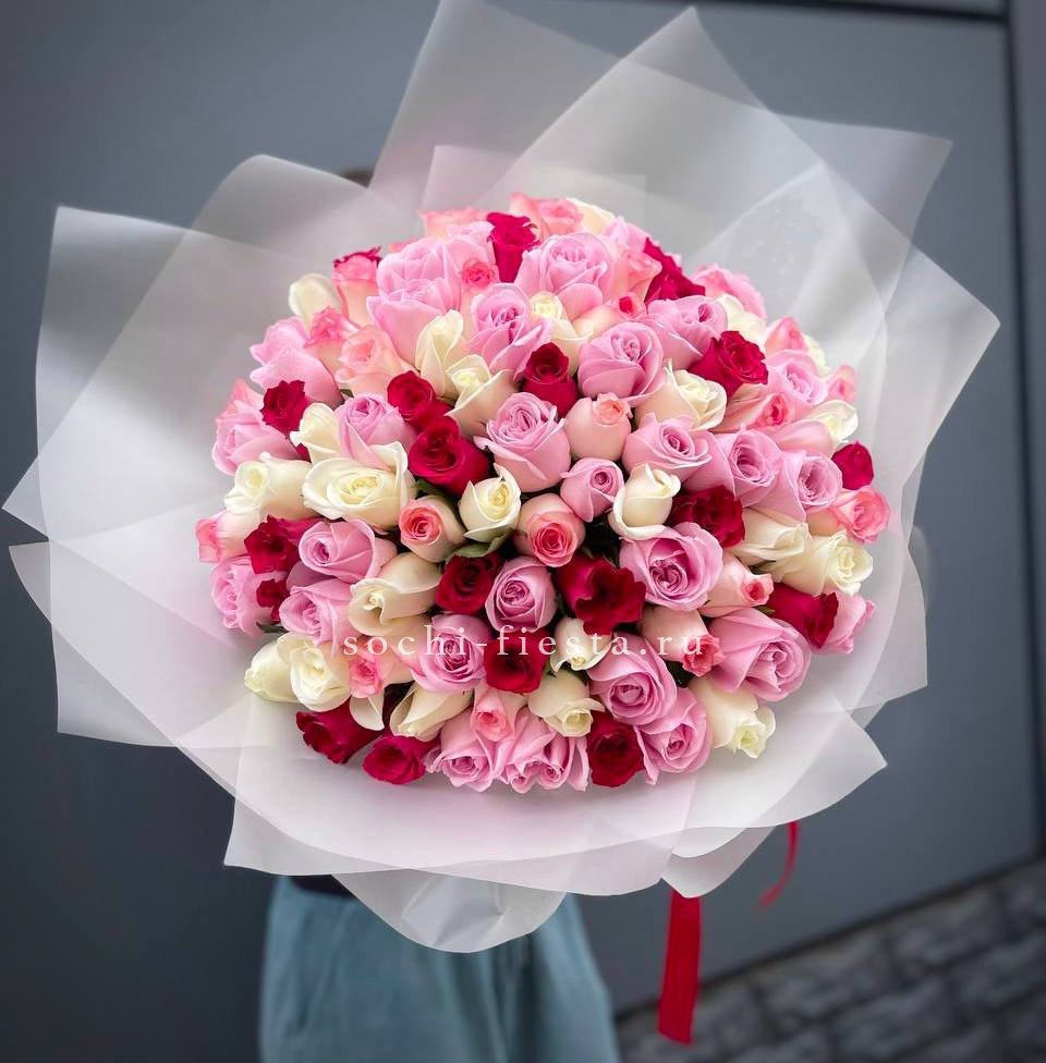 101 роза разноцветных оттенков, лента, упаковка на выбор.