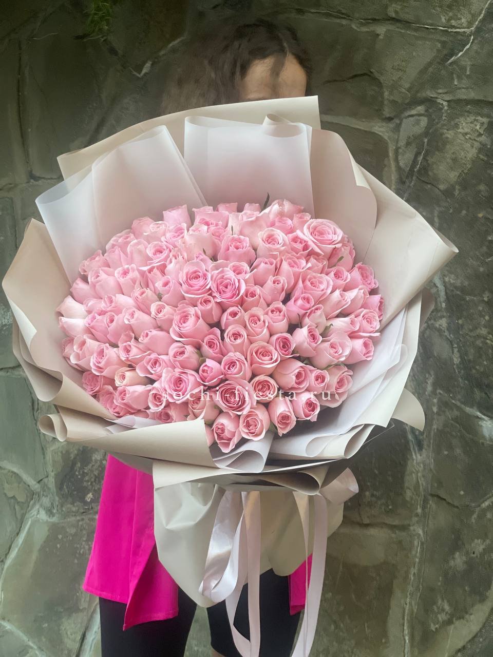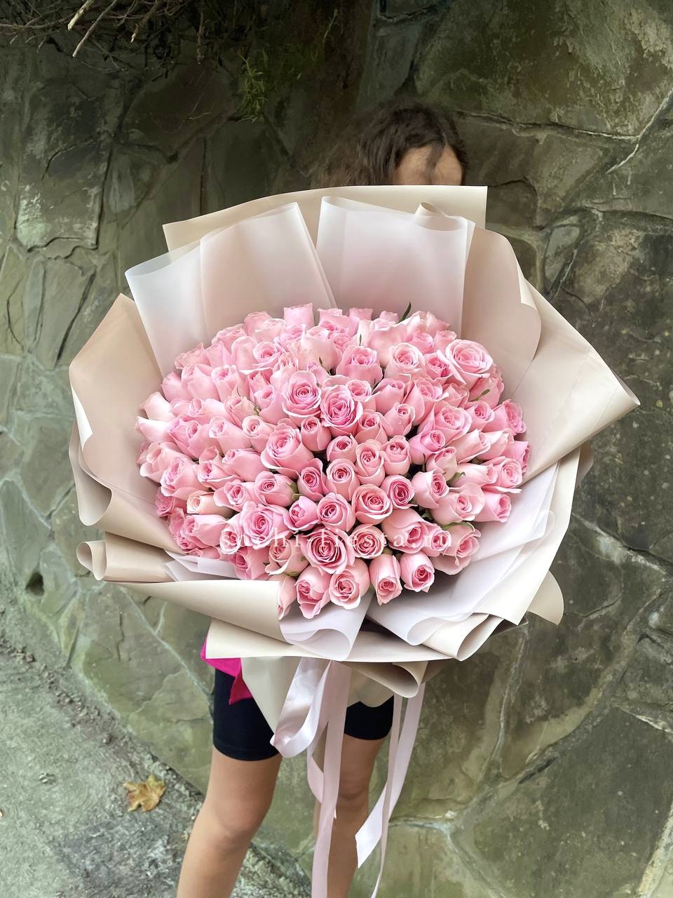 Сто один бутон в бело-розовой палитре создают объёмное облако цвета. Композиция впечатляет масштабом и наполняет пространство мягким сиянием лепестков.