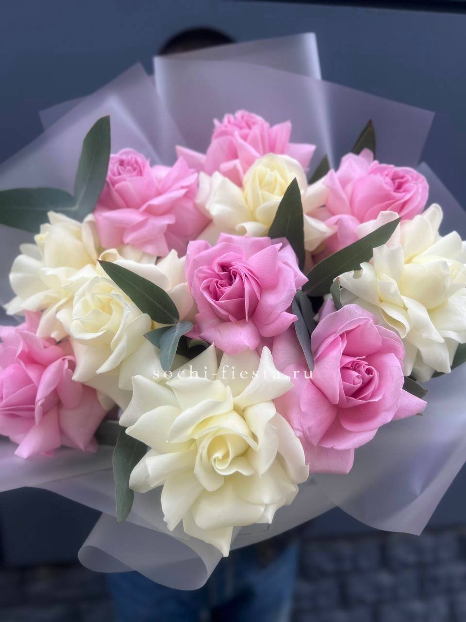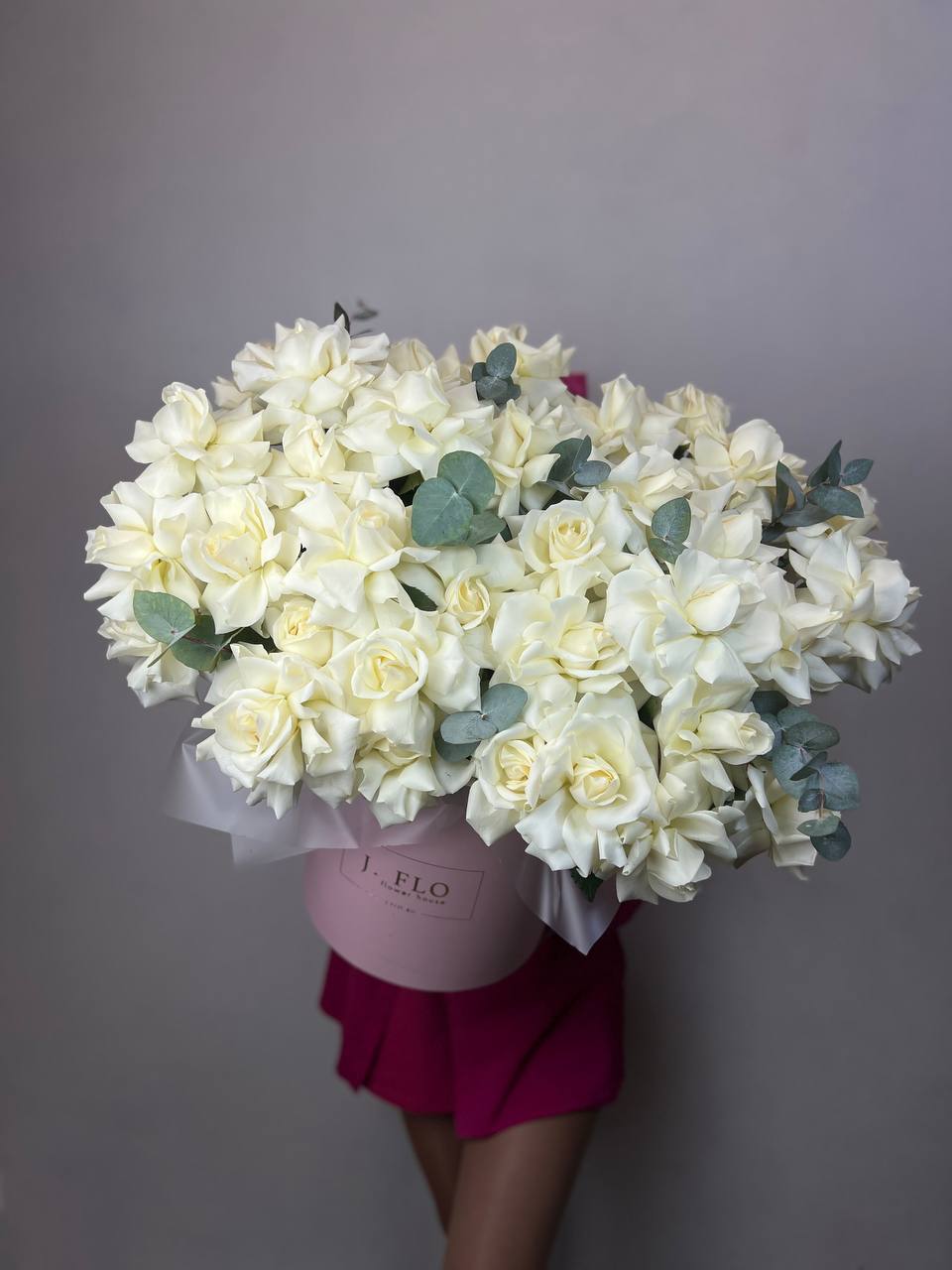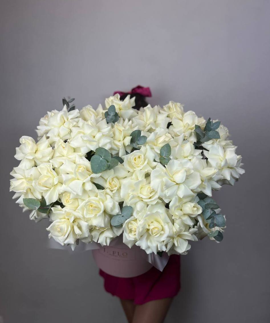 Пятнадцать белых роз собраны в аккуратную сумочку с веточками эвкалипта. Компактная форма позволяет разместить композицию на столе или полке, а матовая зелень добавляет свежести классическому белому цвету.