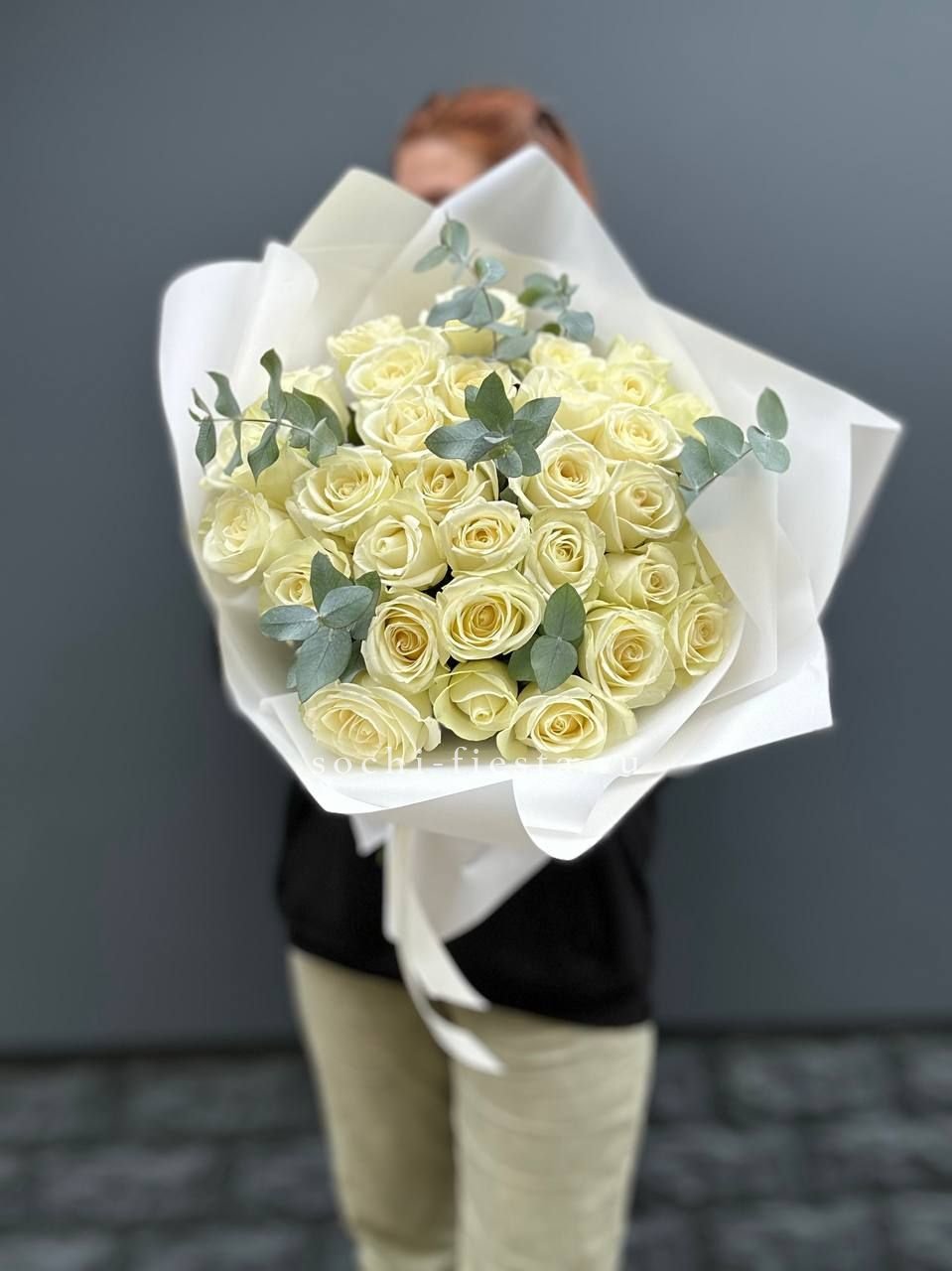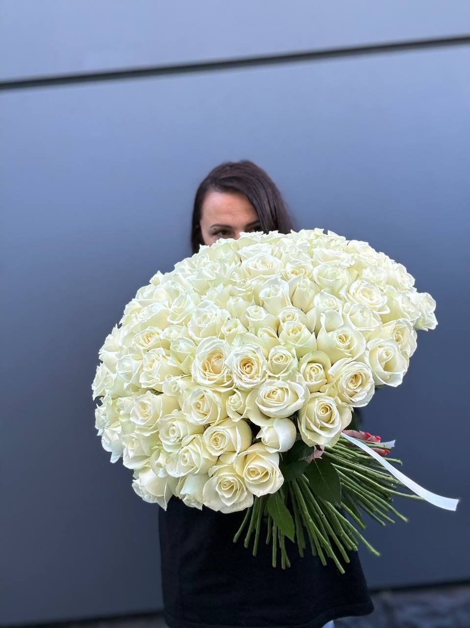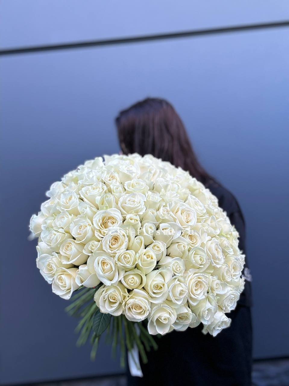Триста три белые розы в единой композиции создают мощное визуальное присутствие. Монохромное решение и масштаб букета производят впечатление с первого взгляда.