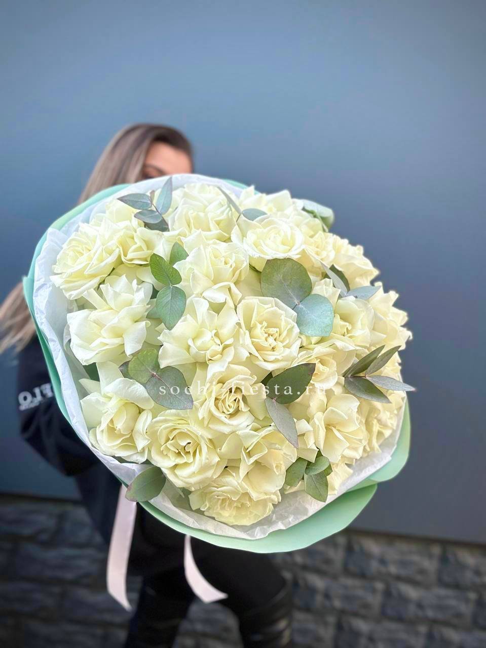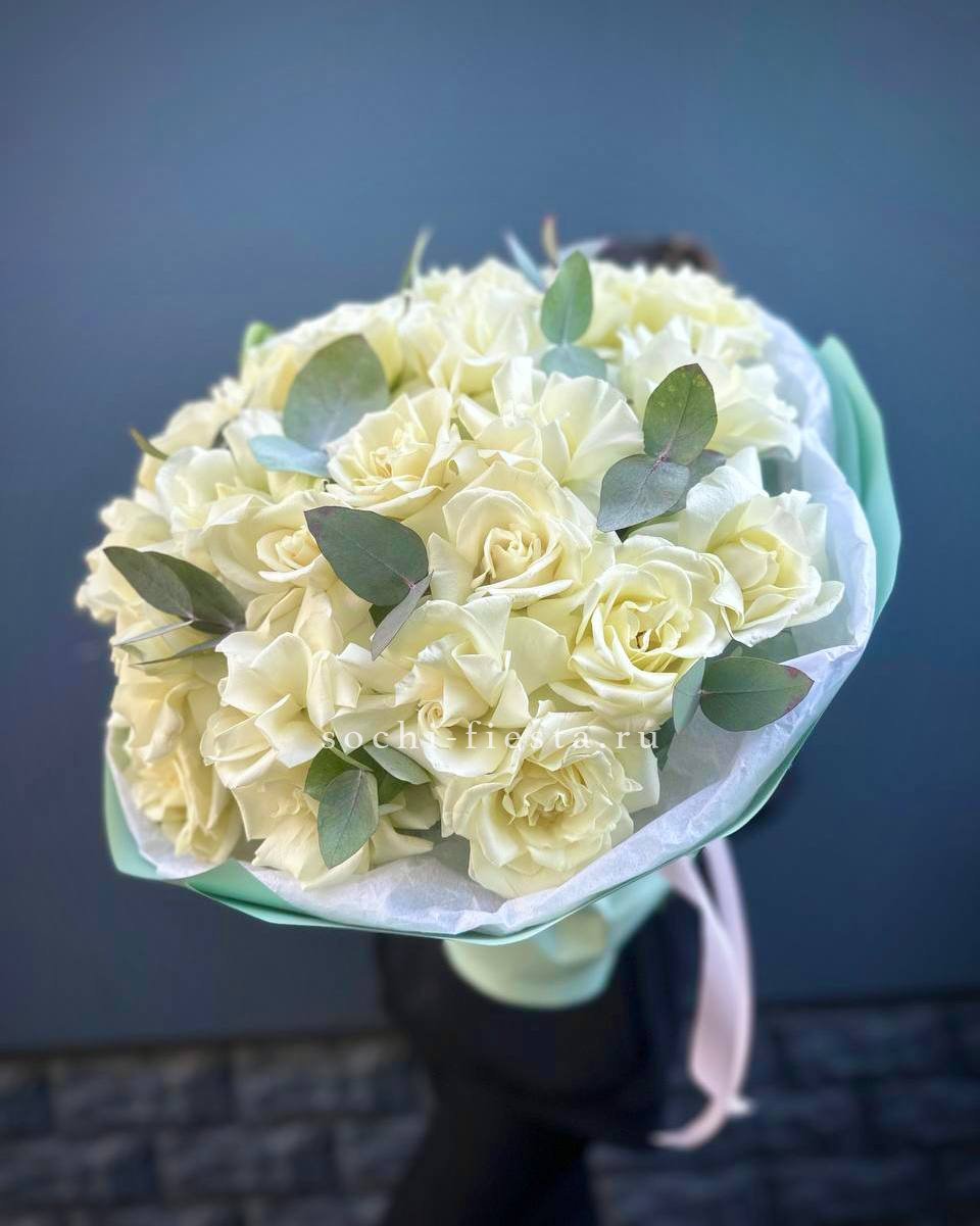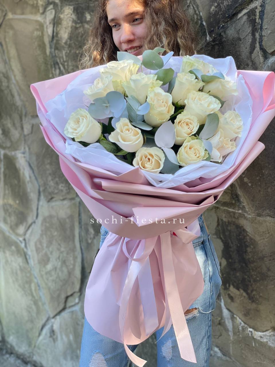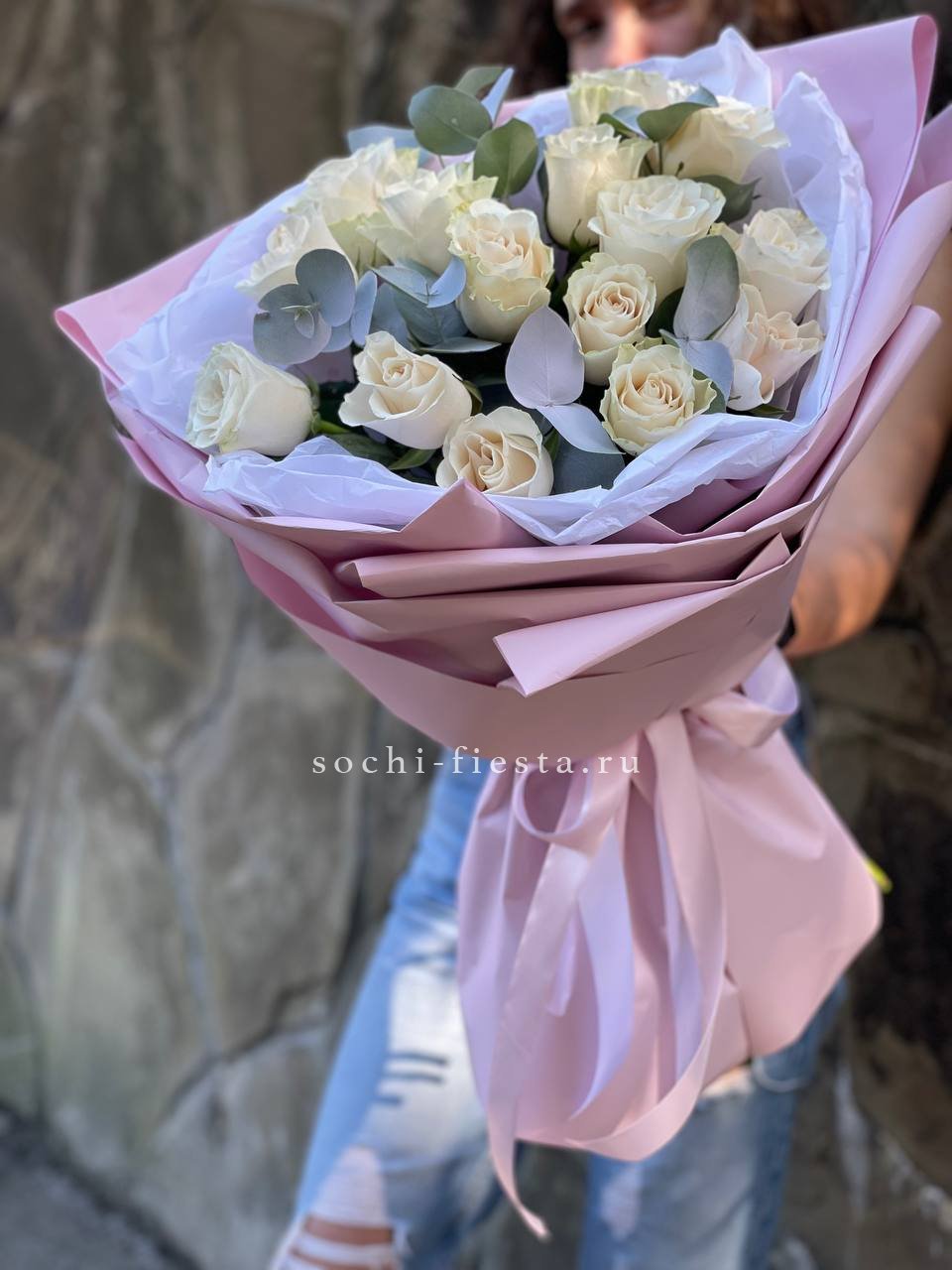 Для заказа товара "Белые розы в авторском оформлении" с доставкой в Перми нажмите в корзину