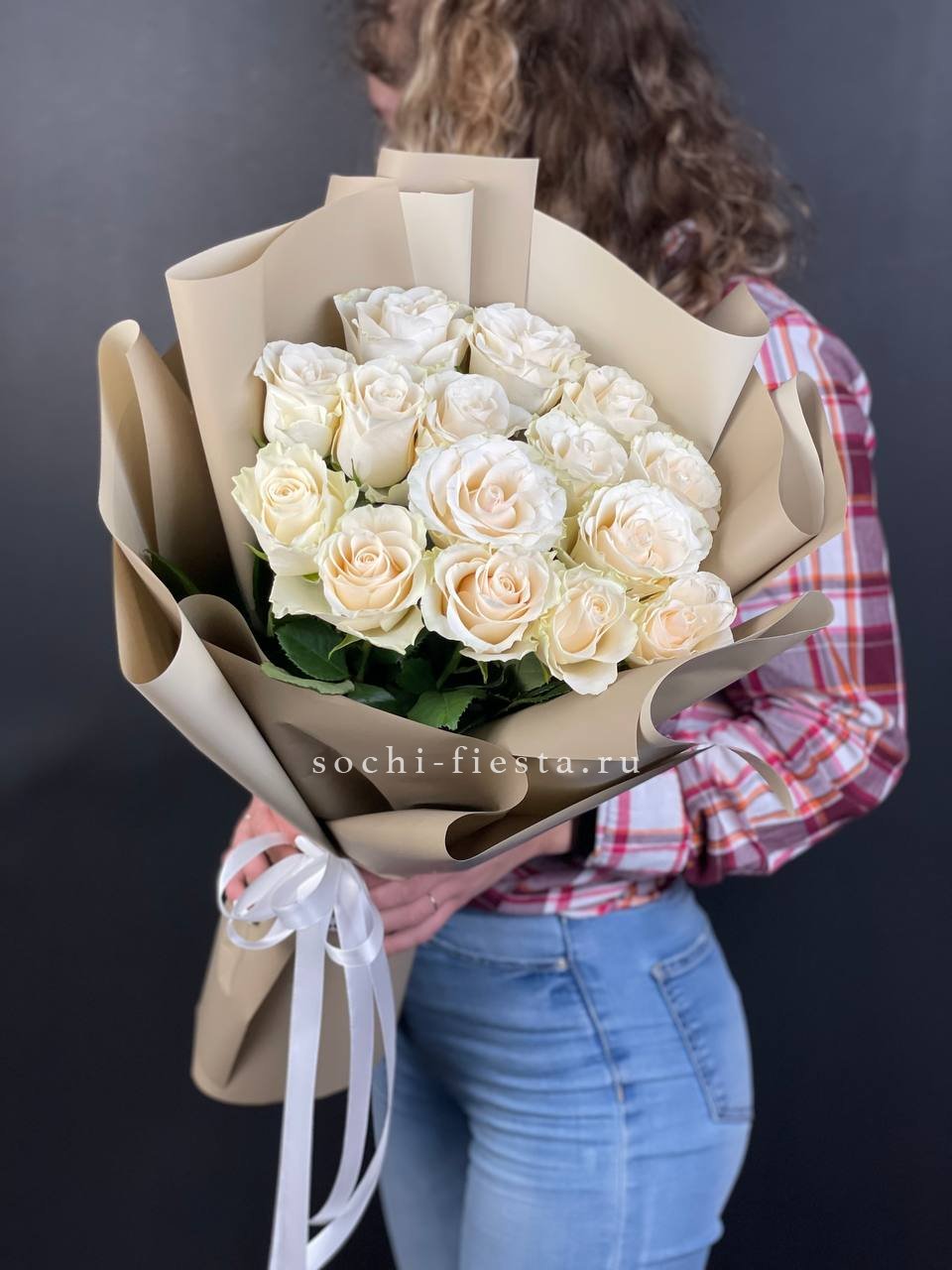 Пятнадцать белоснежных роз собраны в аккуратную форму с ровным силуэтом. Композиция сохраняет свежесть и держит структуру благодаря продуманному размещению бутонов в цилиндре.