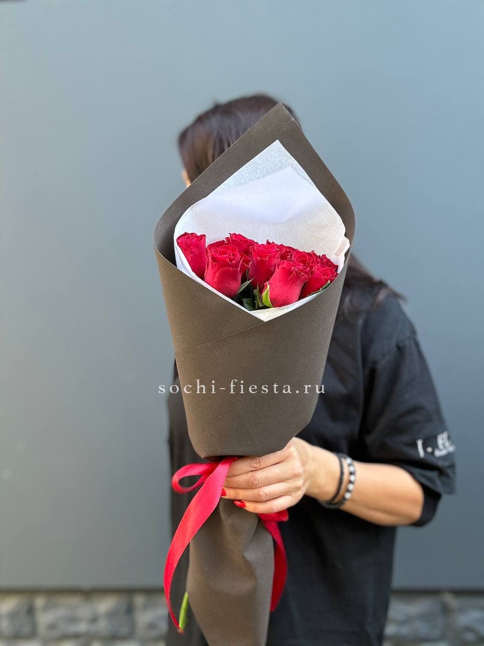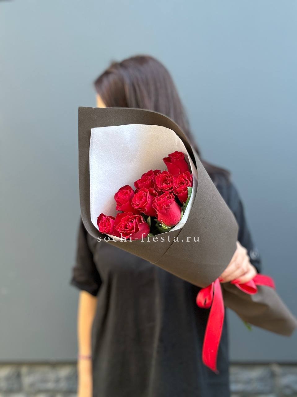 Красные розы в обрамлении чёрного материала — это игра света и тени в одном букете. Тёмный фон усиливает яркость алых лепестков и добавляет композиции графичности.