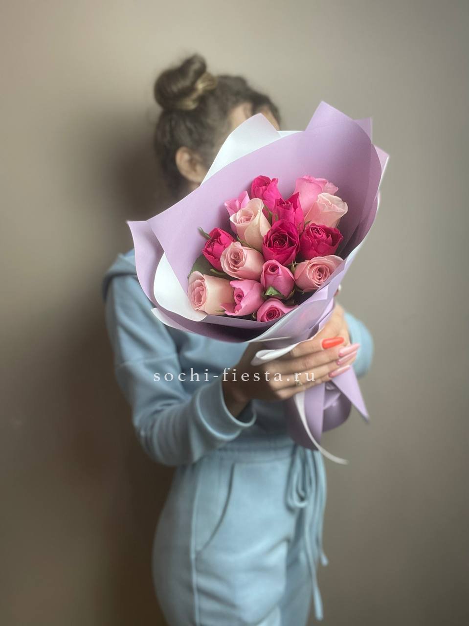 Пятнадцать кенийских роз в яркой палитре оттенков создают живую композицию с плотным силуэтом. Каждый бутон раскрывается по-своему, добавляя букету объём и динамику.