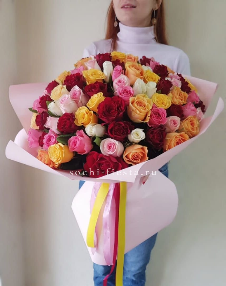 Сто один цветок в пастельной гамме создает объемное облако из бутонов. Розы разных оттенков перетекают друг в друга, формируя мягкую цветовую волну. Композиция, которая впечатляет масштабом и воздушностью.