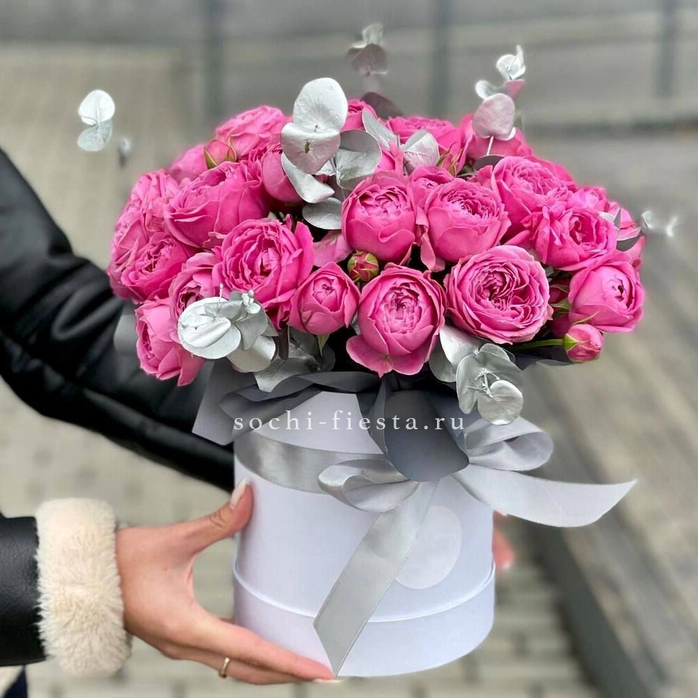 Семь пышных кустовых роз собраны в плотный круг и обрамлены воздушными ветками хамелациума. Бутоны раскрыты почти полностью, создавая объёмную шапку с мягкими переходами оттенков. Композиция держит форму и выглядит самодостаточно.