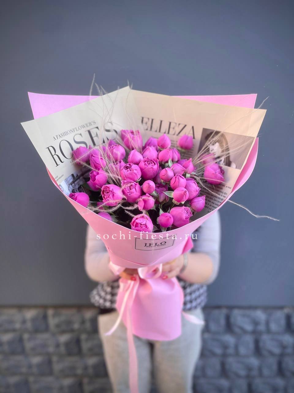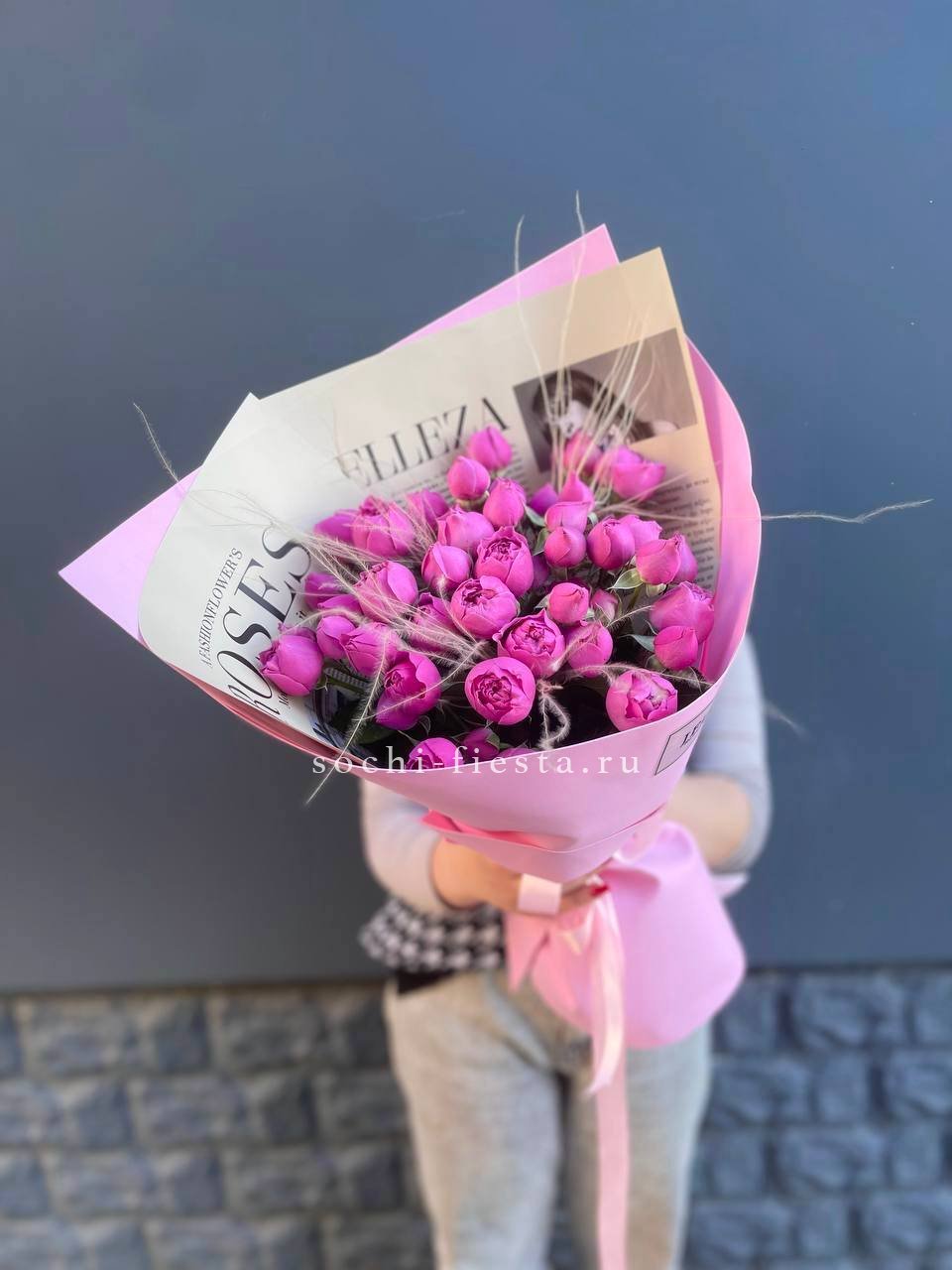 25 пионовидные кустовые розы,  хлопок, лента, дизайнерская упаковка.