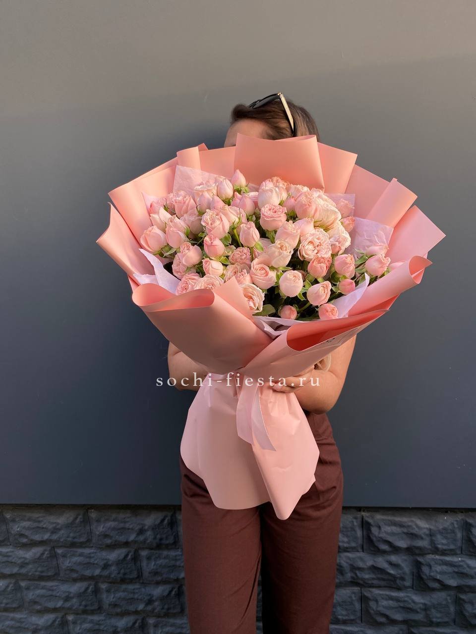 Двадцать пять кустовых роз Бомбастик собраны в пышную композицию с выраженной округлой формой. Плотные многолепестковые бутоны располагаются близко друг к другу, создавая насыщенный визуальный ритм и объемную структуру букета.
