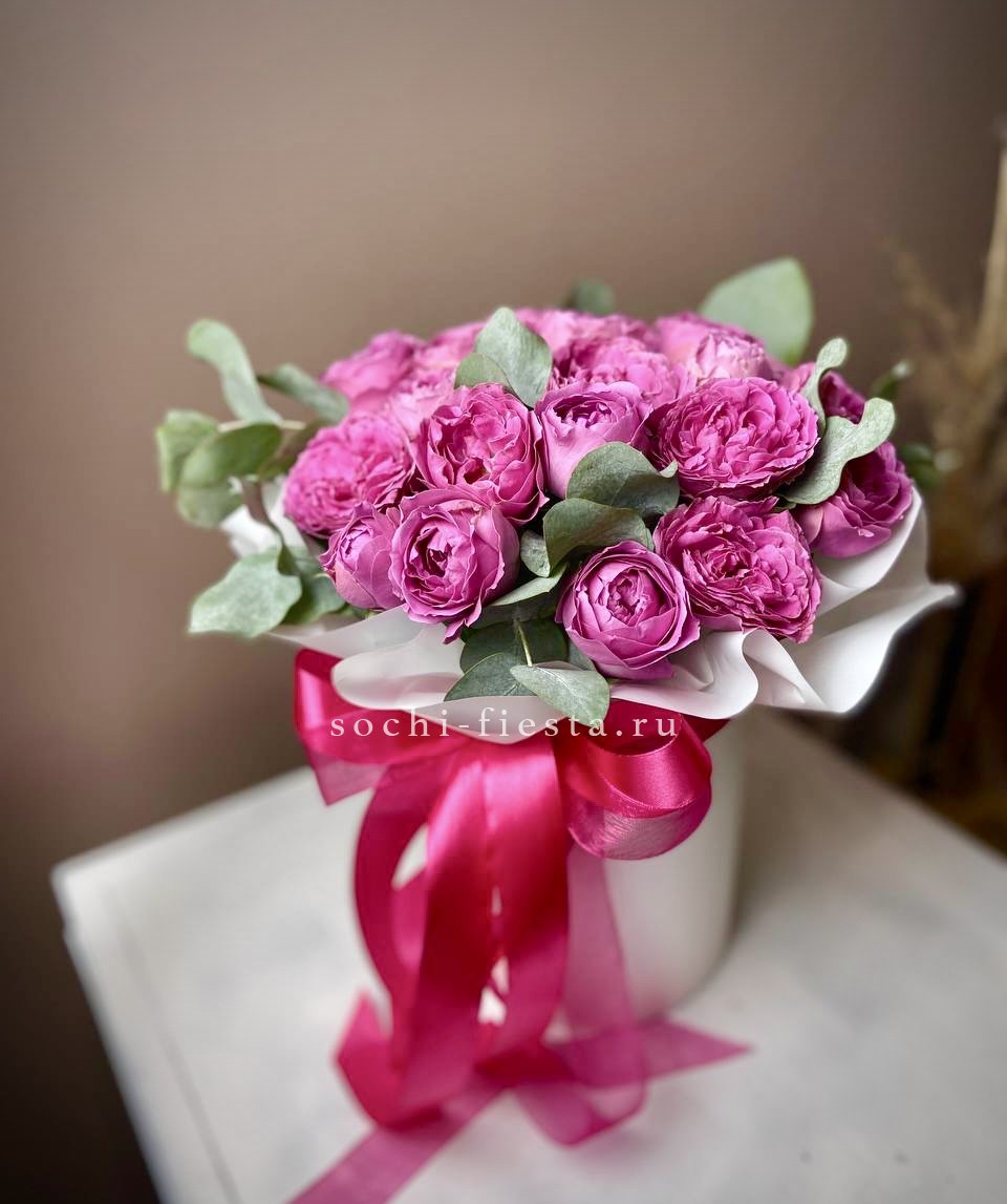 Спрей-розы раскрываются кустиками на гибких стеблях, образуя лёгкую живую структуру. Пятнадцать веток с множеством мелких бутонов придают букету естественную подвижность.
