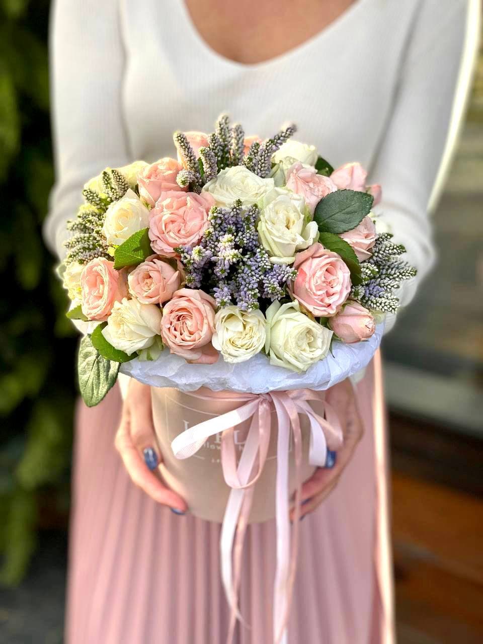 Пятнадцать кустовых роз собраны в плотную округлую форму. Мелкие бутоны создают воздушную текстуру и мягкий объём в пространстве.