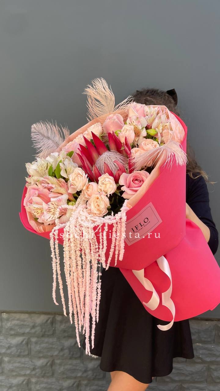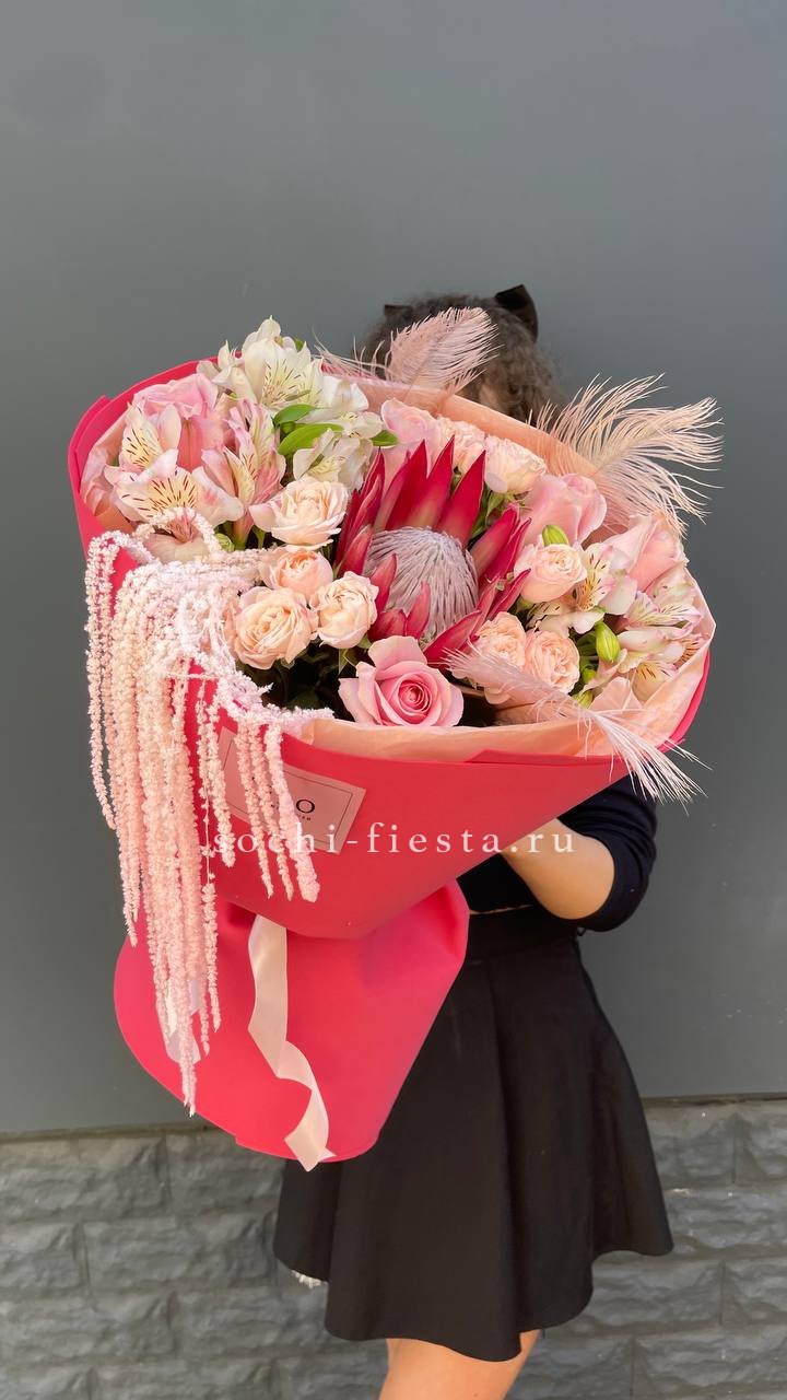 протея, кустовые розы, одноголовые розы, альстромерии, перья, амарант, лента и дизайнерская пленка.