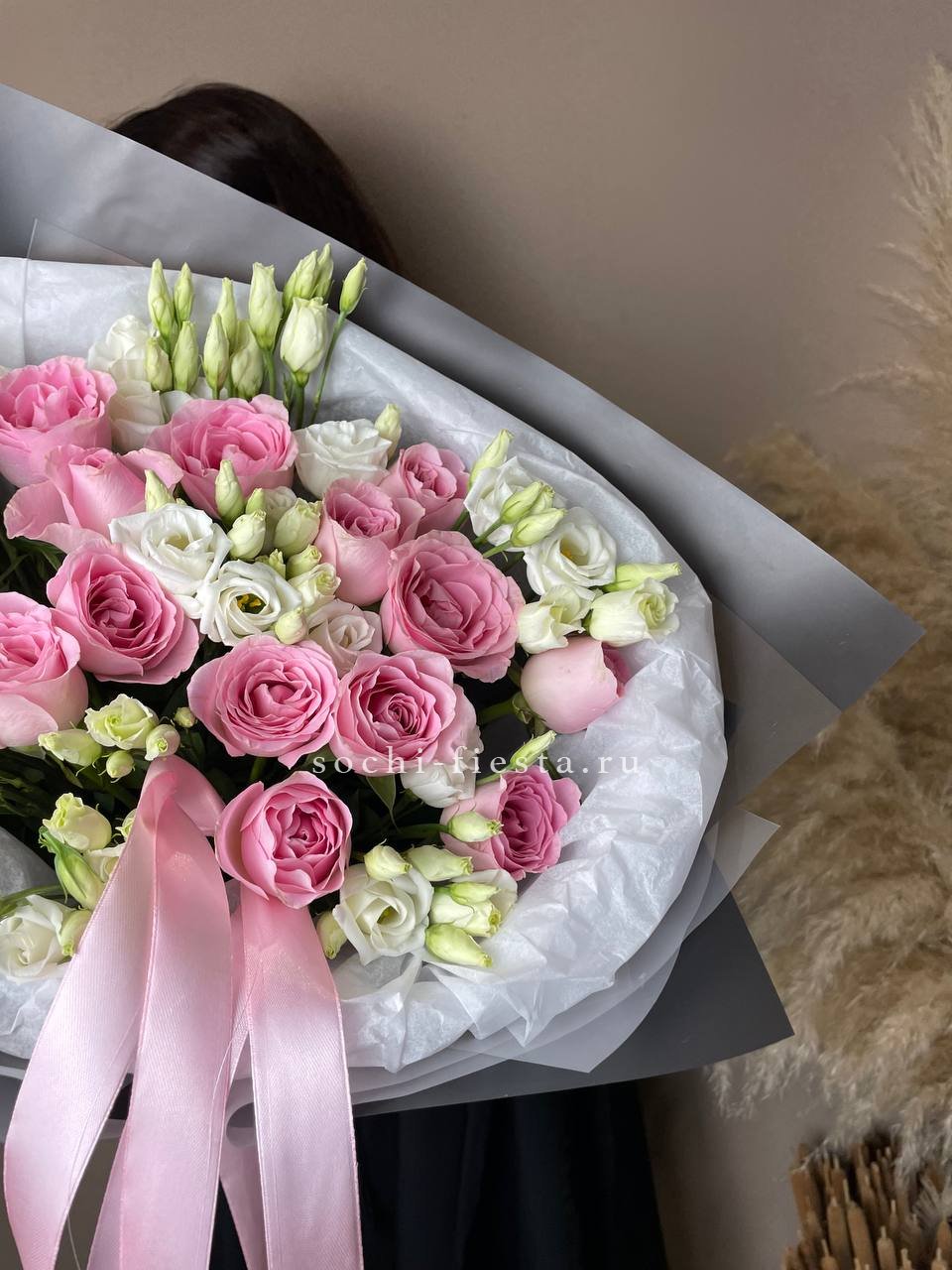 гортензия, розовые розы, диантусы, эустома, маттиолы, эвкалипт лента и дизайнерская пленка.