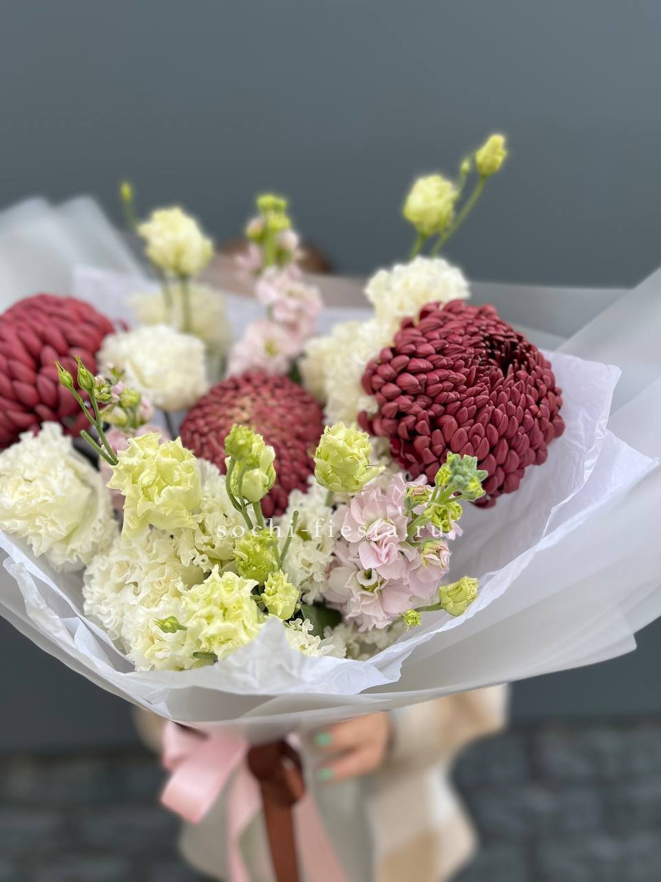 воздушный букет из стойкой маттиолы, эустомы и хризантемы Бигуди в оформлении.