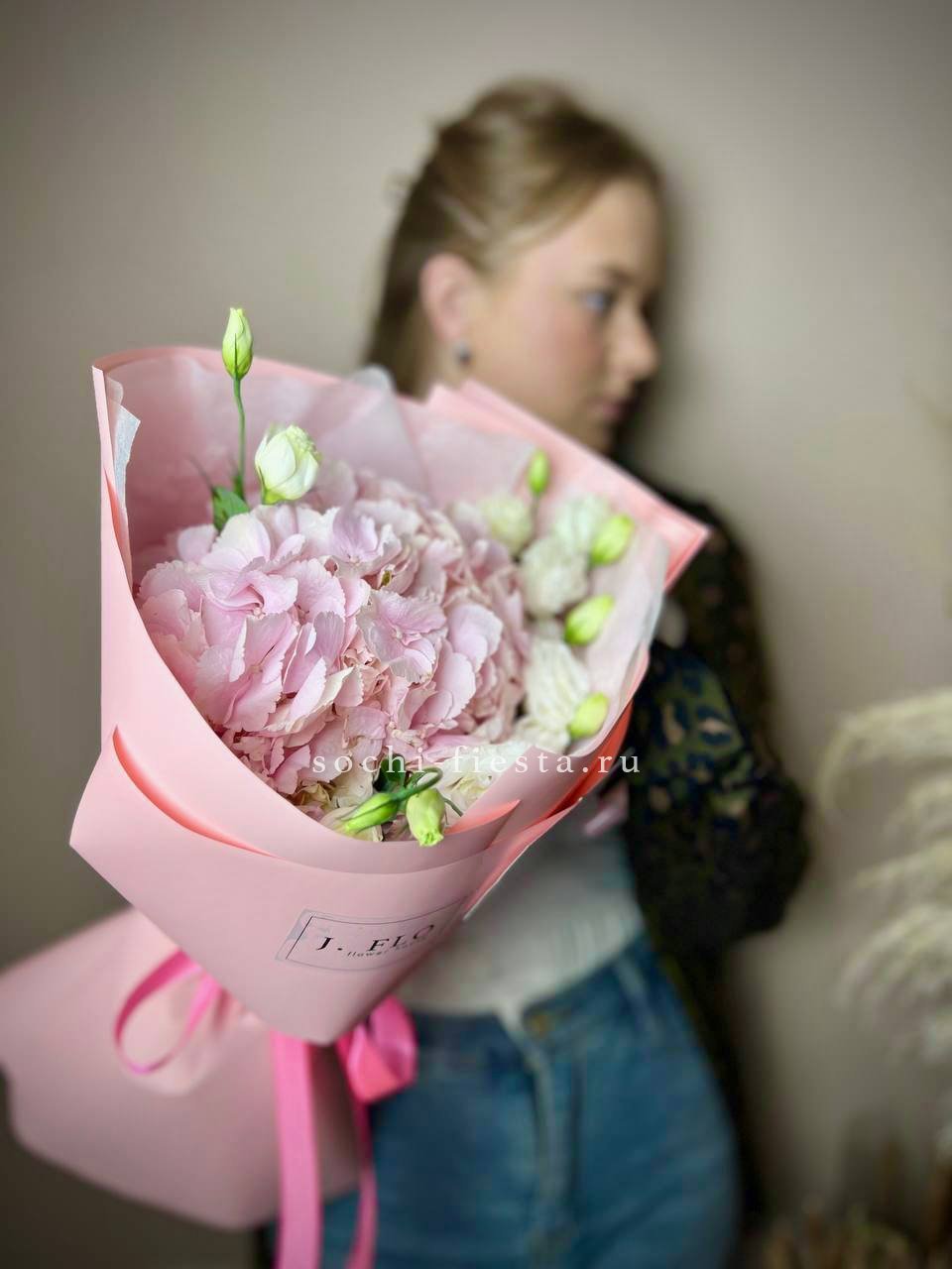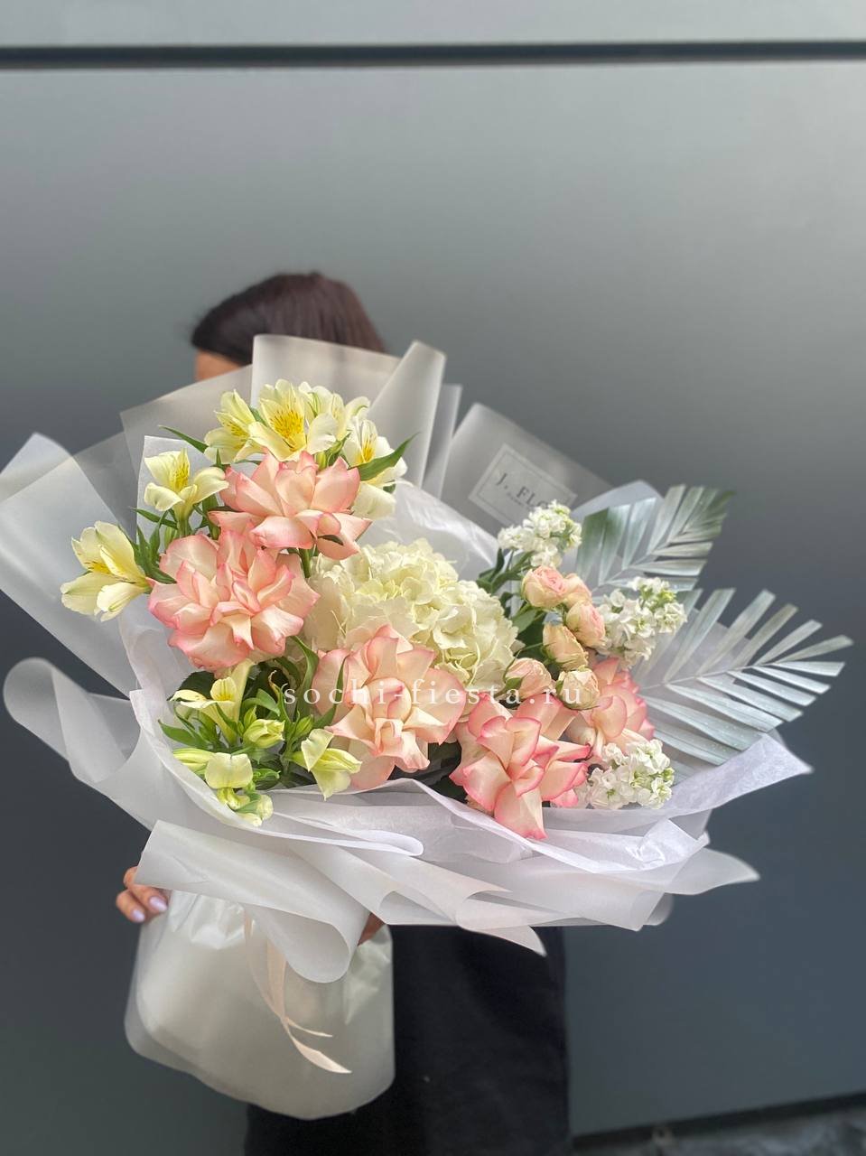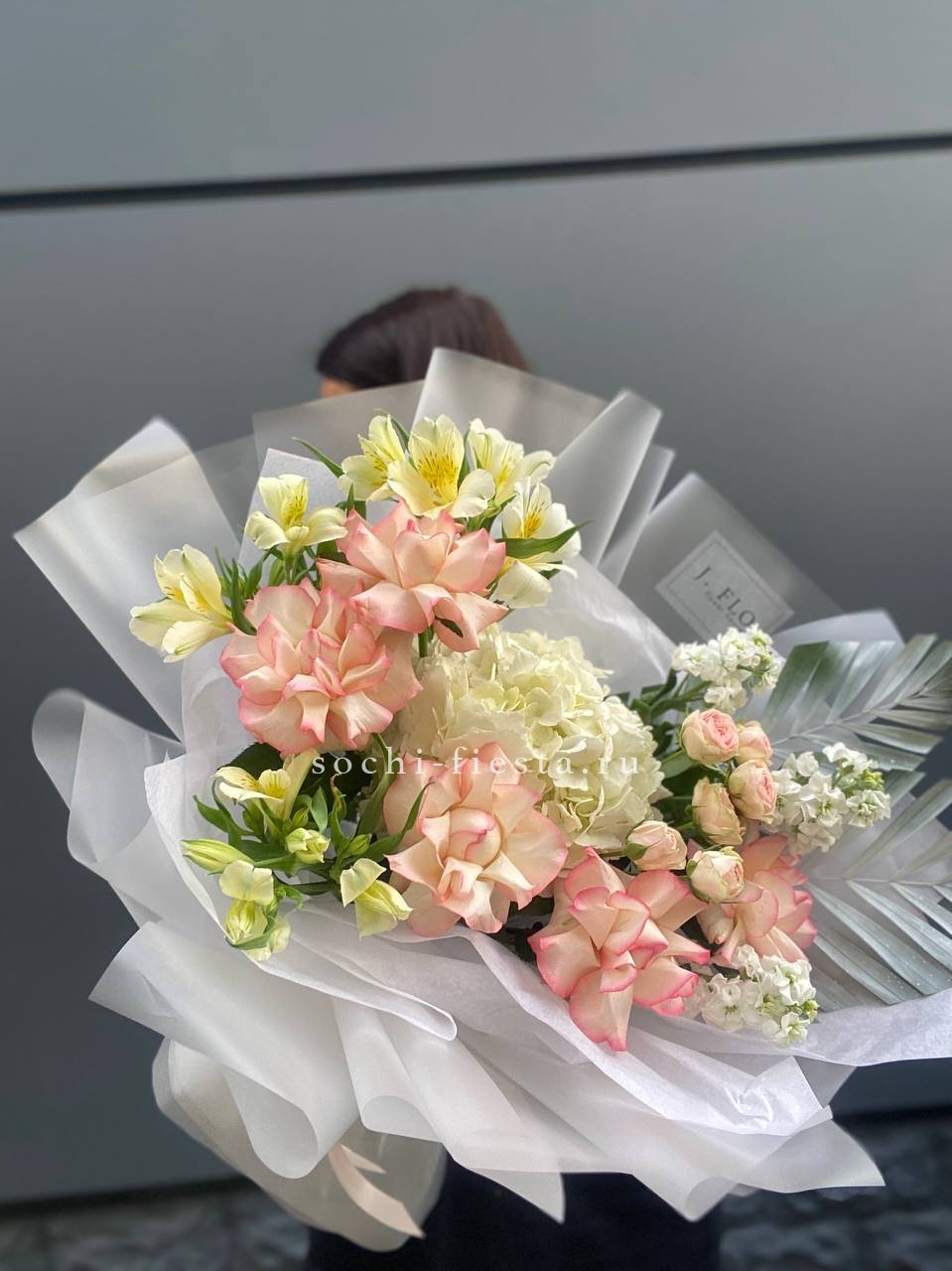 французские розы, маттиола, гортензии, эвкалипт, стифа, упаковка, лента.