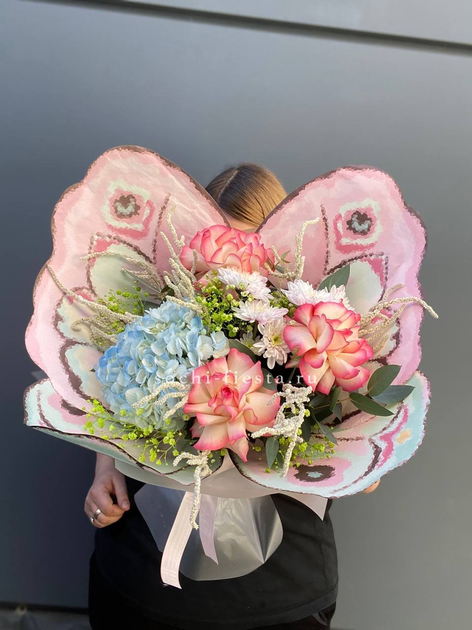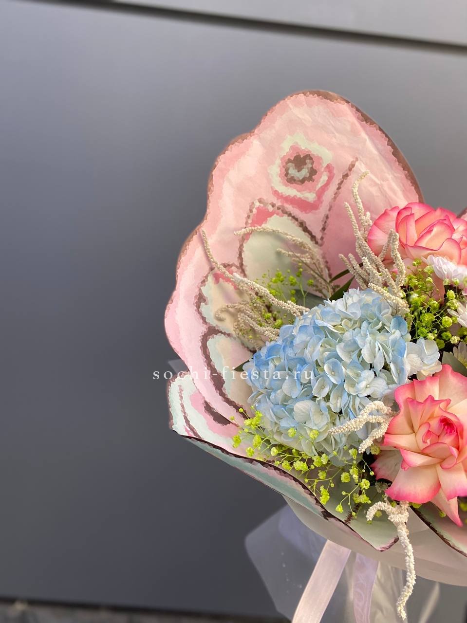 гортензия, французские (вывернутые) розы, лента, дизайнерская пленка, тишью.
