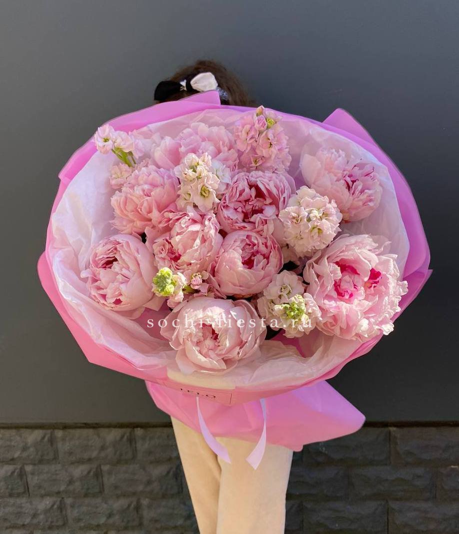 Пышные бутоны пионов с воздушной маттиолой собраны в композицию с мягкими линиями. Тишью и лента завершают образ, добавляя лёгкости и объёма.