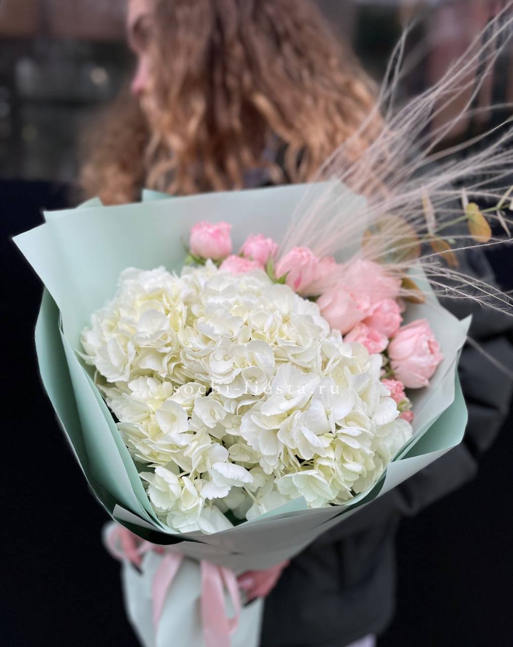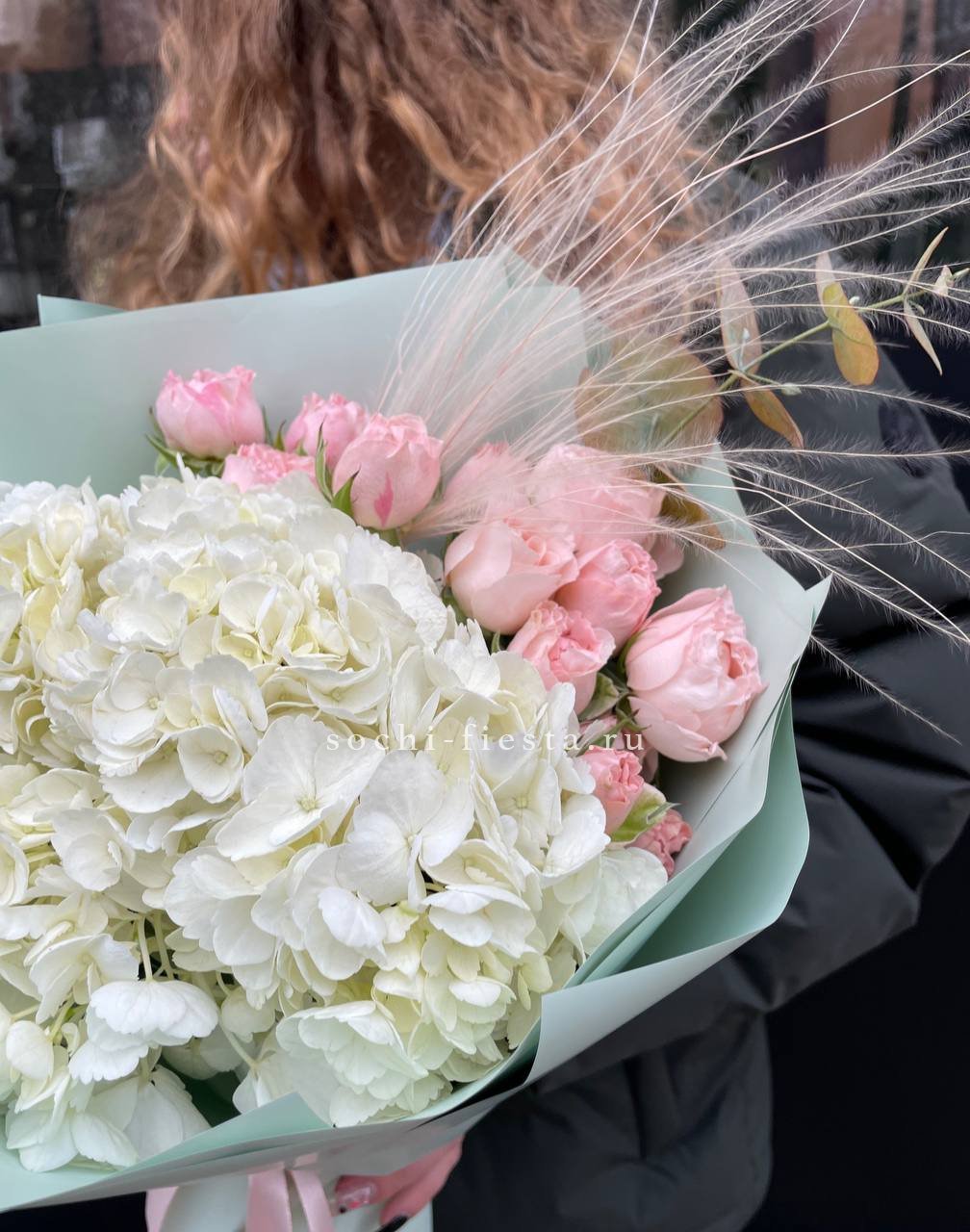 Воздушные соцветия лагуруса создают мягкую дымку вокруг роз и хризантем. Букет собран с ощущением лёгкости и простора, словно морской бриз коснулся каждого лепестка.