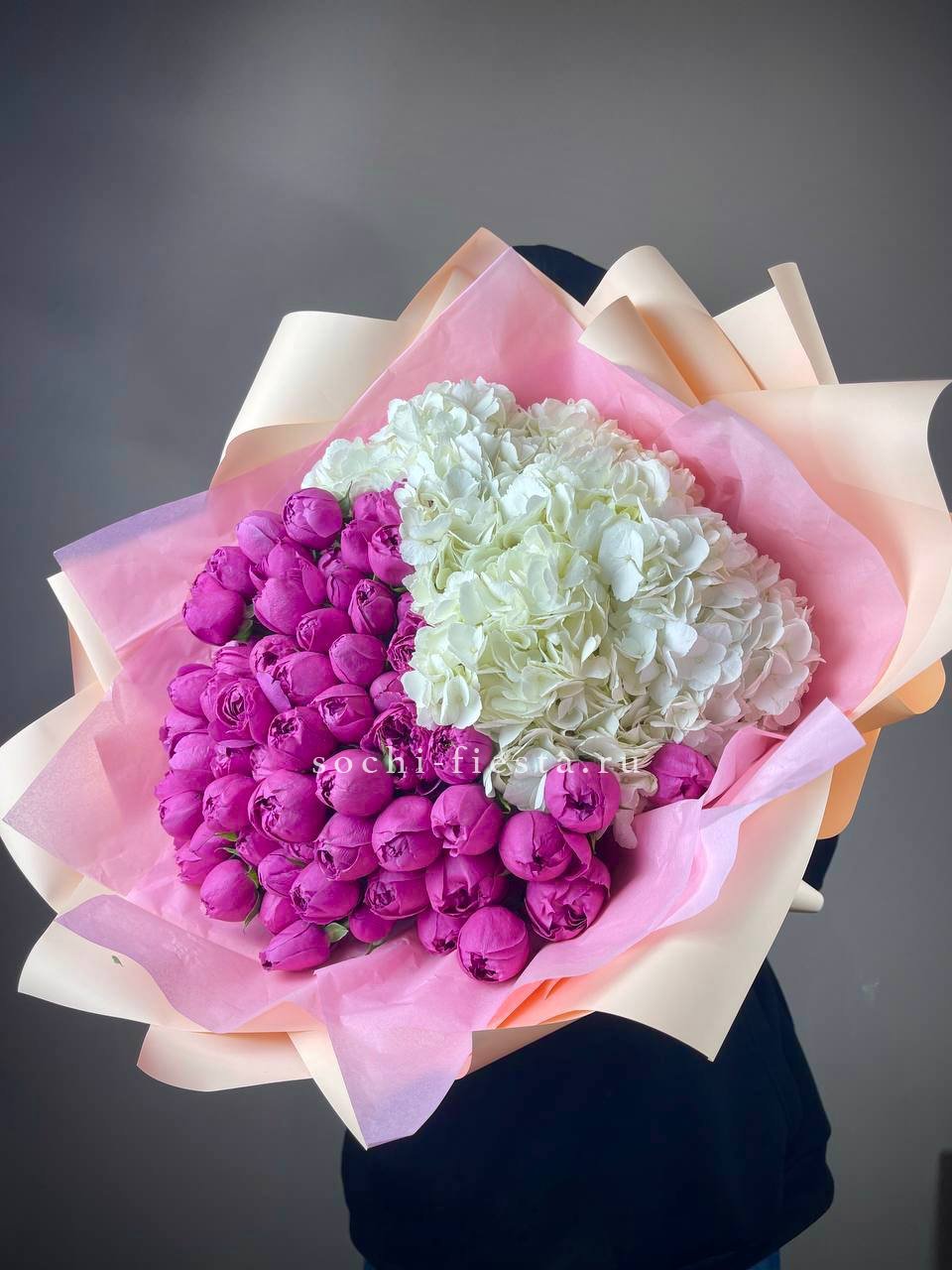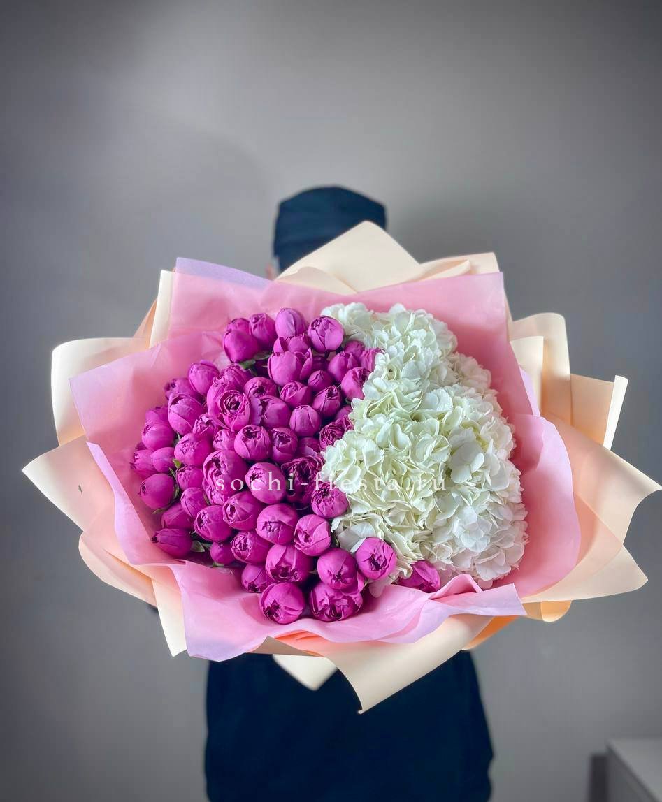 Воздушная композиция с крупными соцветиями гортензии и пышными розами создает ощущение легкости и объема. Эвкалипт добавляет свежести, а бомбастик расставляет яркие акценты между бутонами.