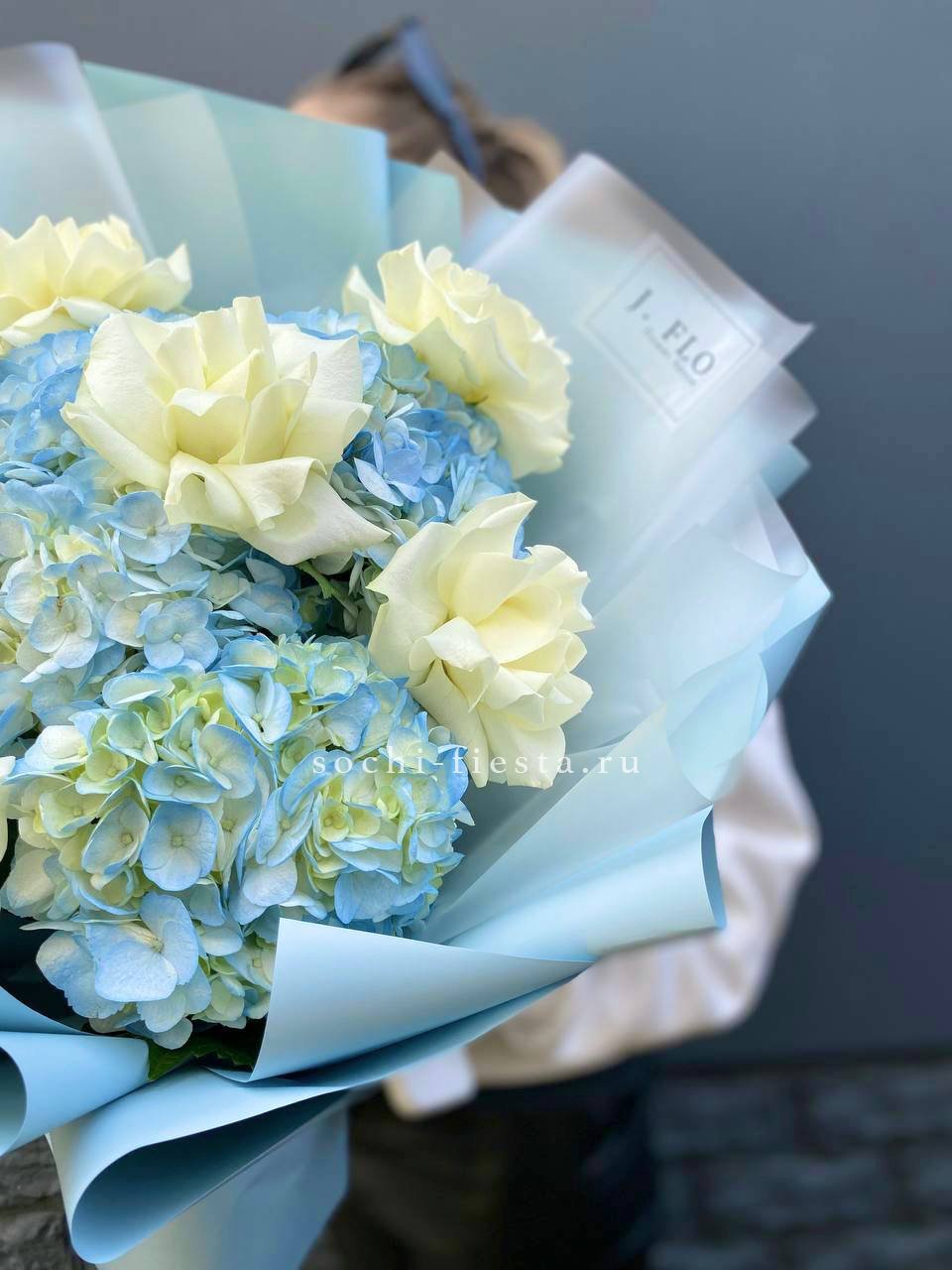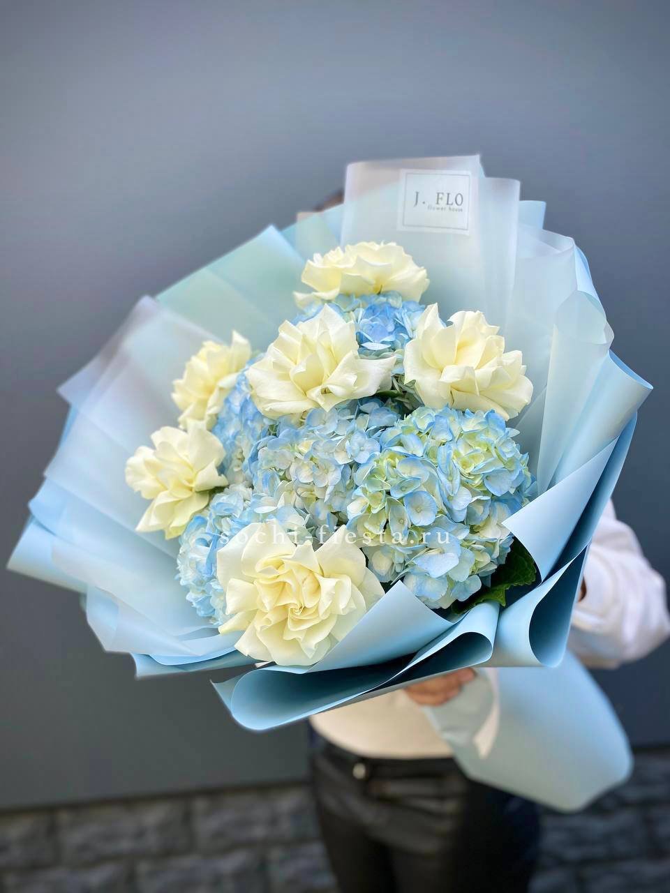 Пастельные оттенки гортензий переплетаются с белоснежными хризантемами, создавая воздушную дымку. Мягкие переходы тонов напоминают утренний туман над садом.