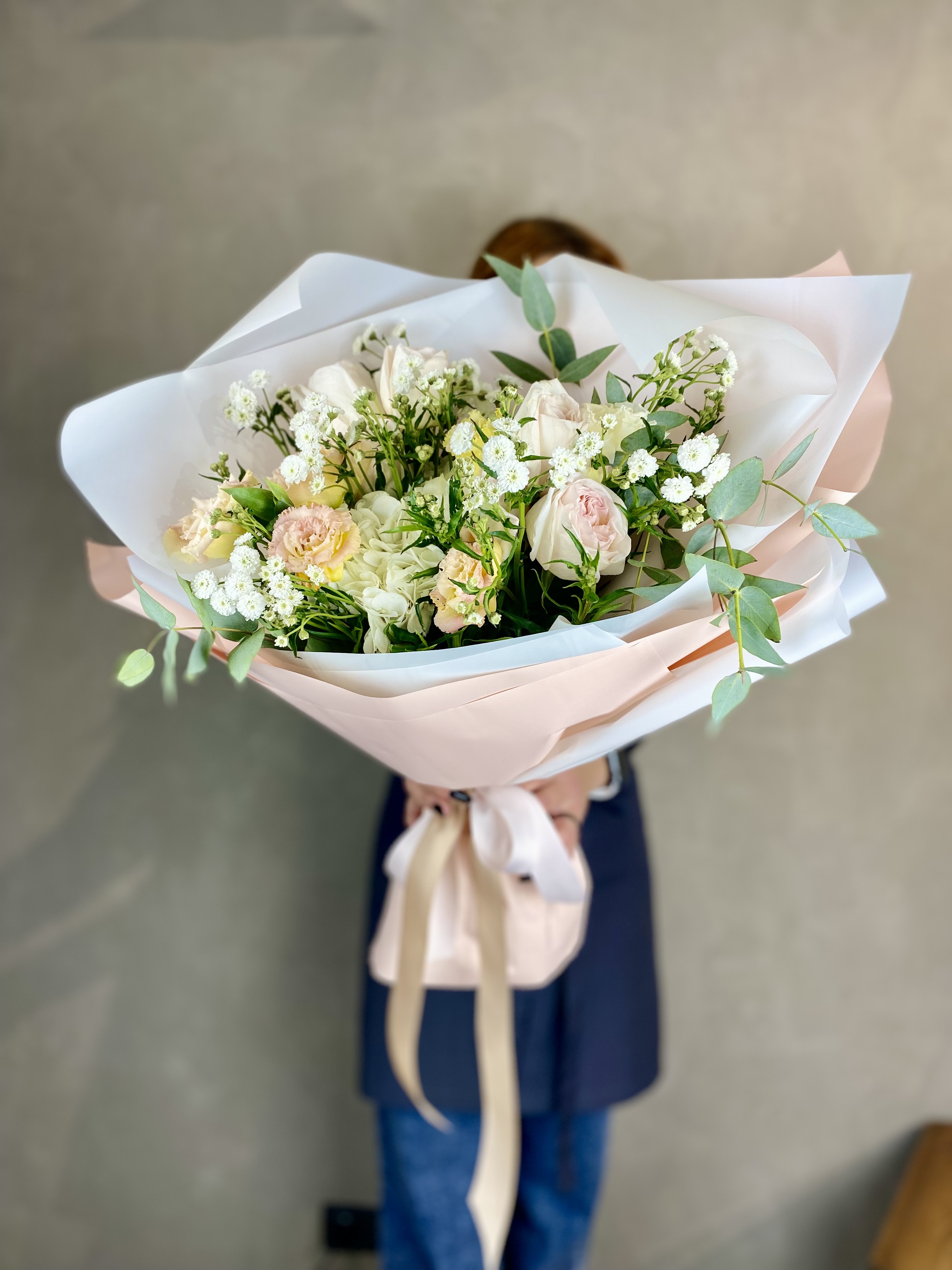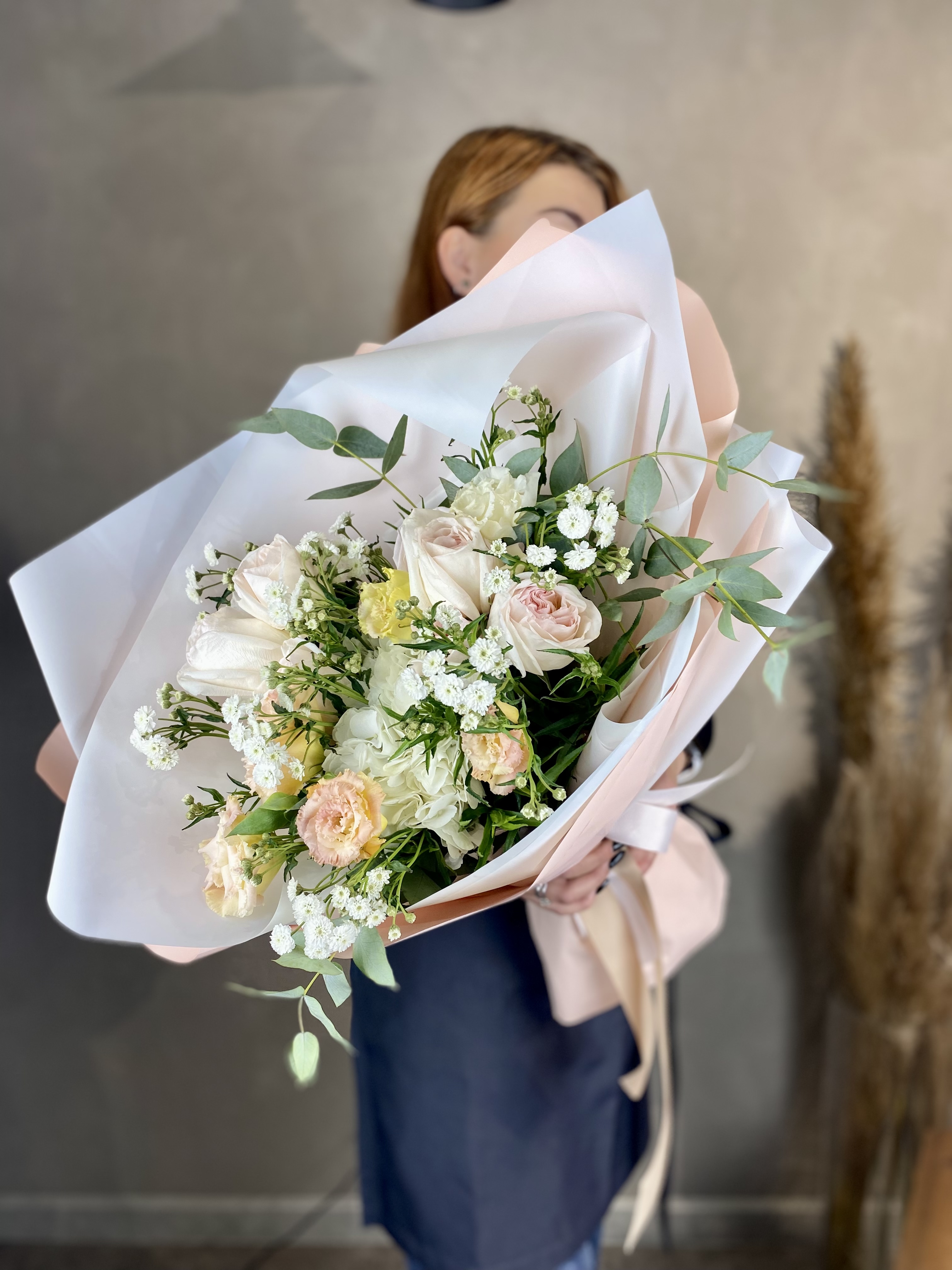 Гортензия задаёт пышную основу, а маттиола и лимониум наполняют букет текстурной глубиной. Французские розы и ковыль создают динамику, которая оживляет композицию и придаёт ей выразительность.