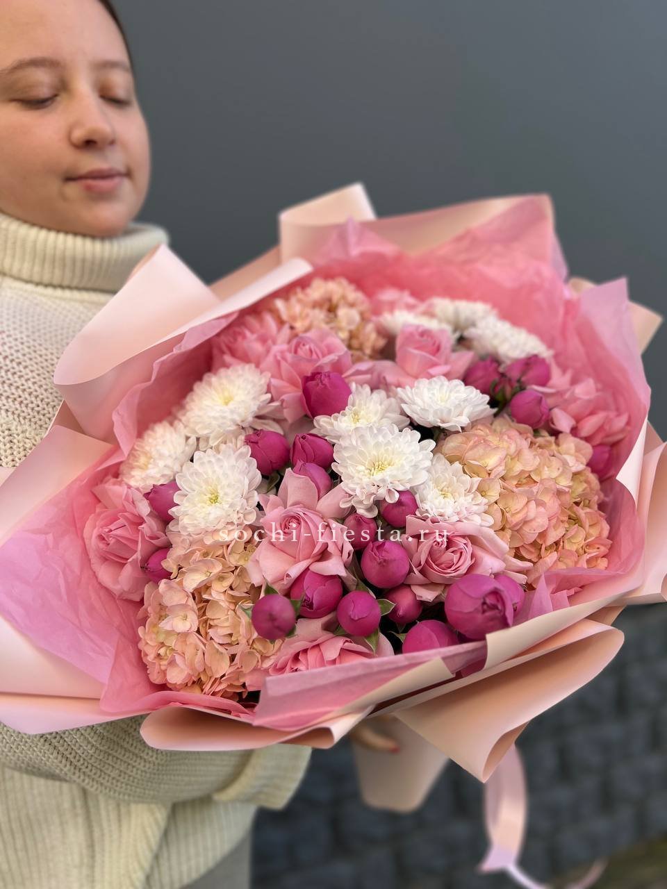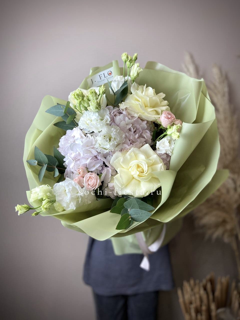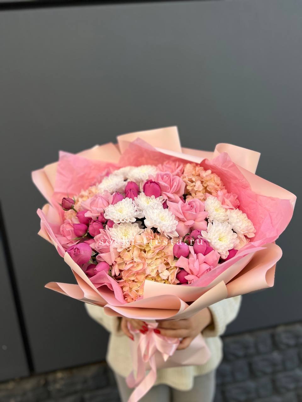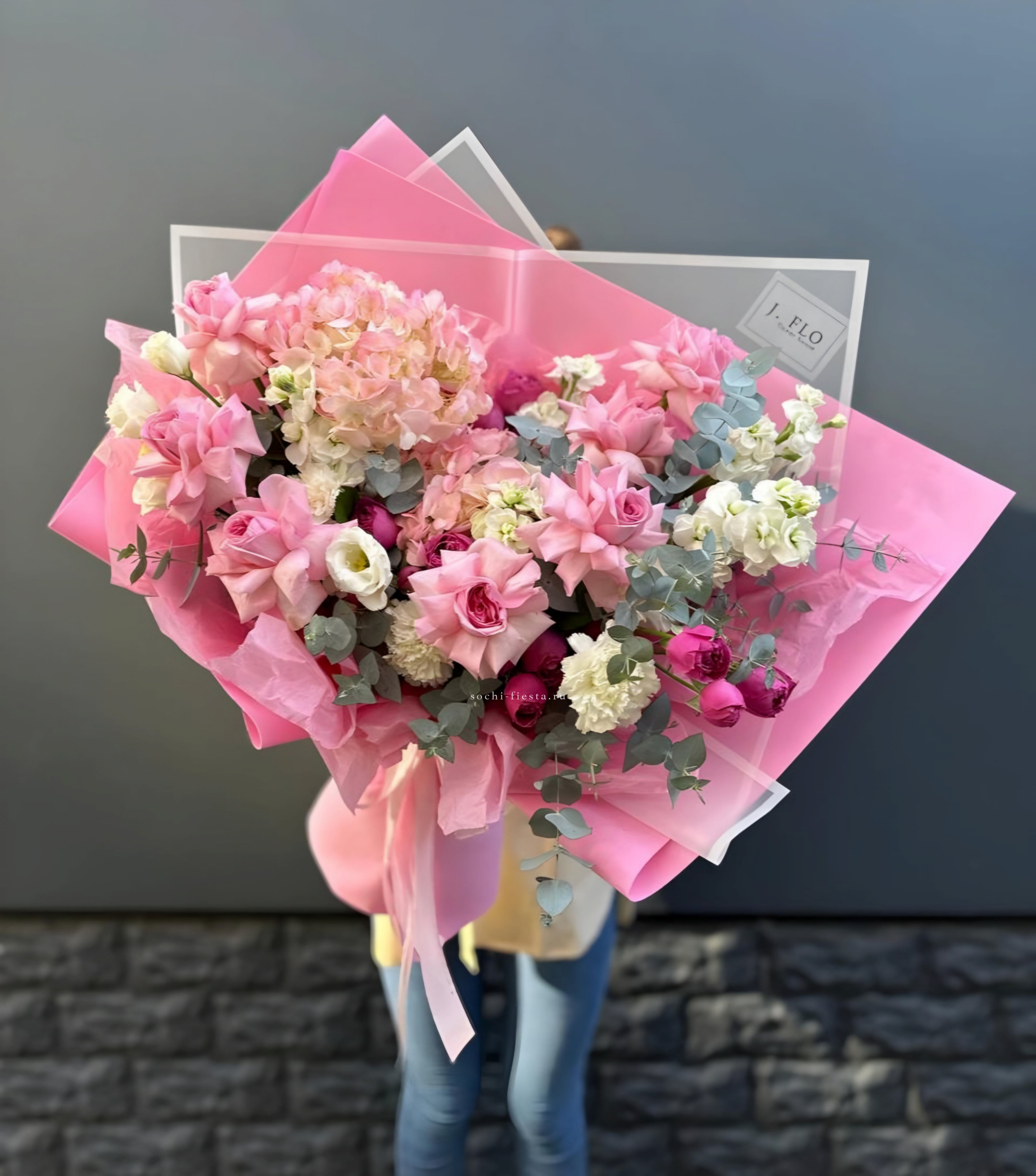 Плотная сборка с пышной гортензией в центре и рассыпчатыми соцветиями диантуса по краям. Эустома добавляет воздушности, а ветки озатамуса создают лёгкую графику. Букет держит форму и выглядит объёмно с любого ракурса.