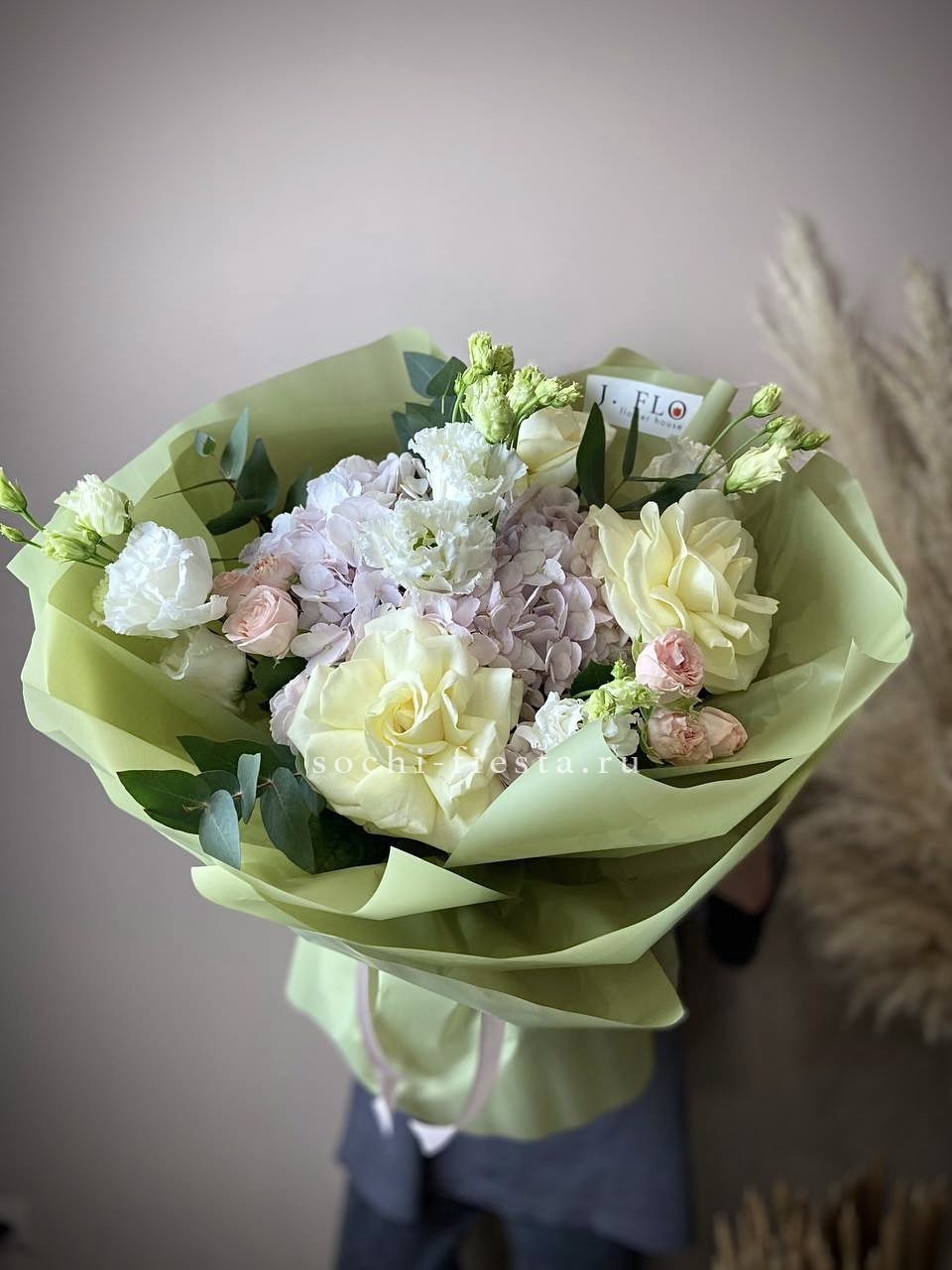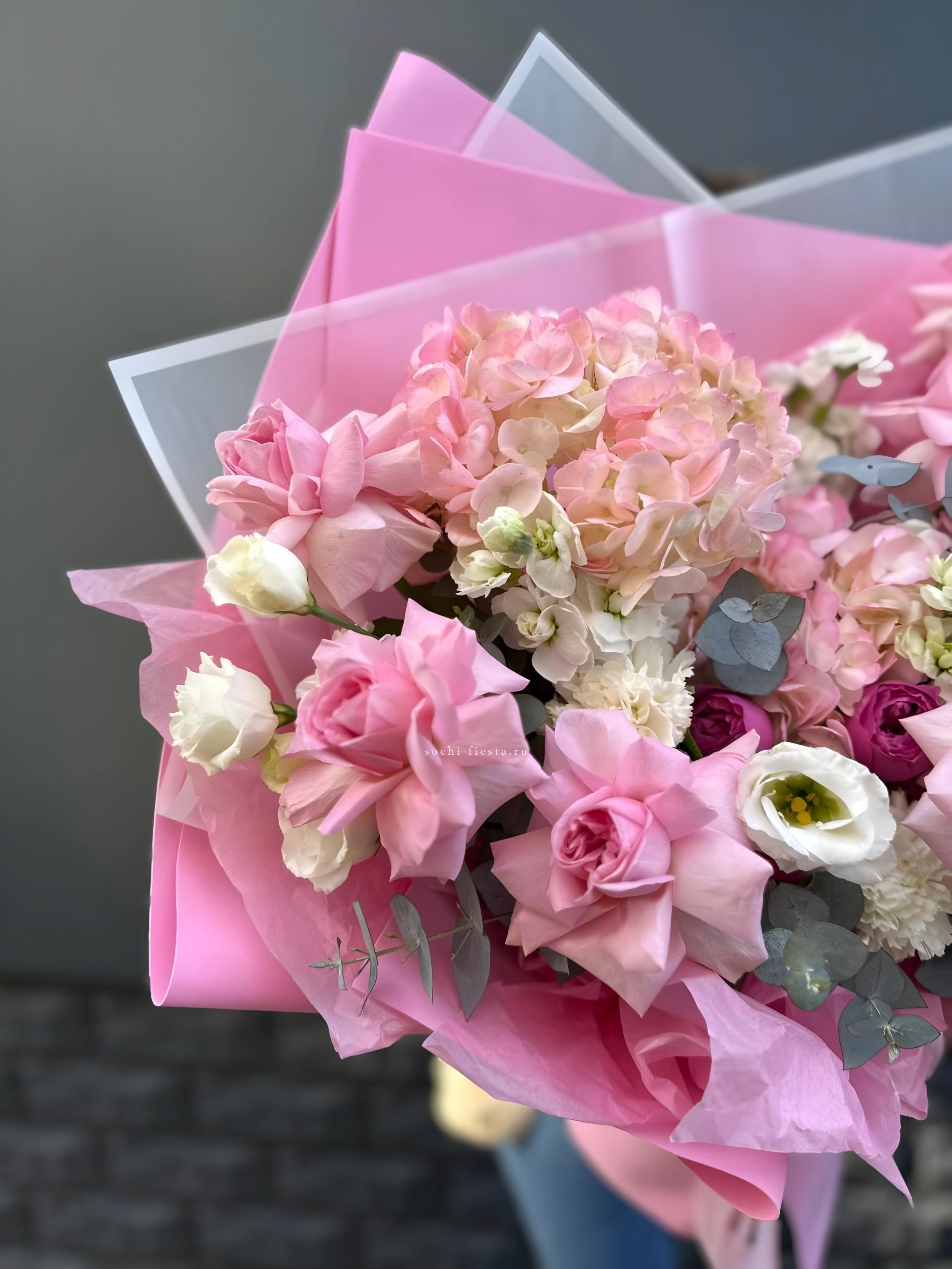 диантус, эустома, гортензия, хайди, эвкалипт, озатамус, пленка.