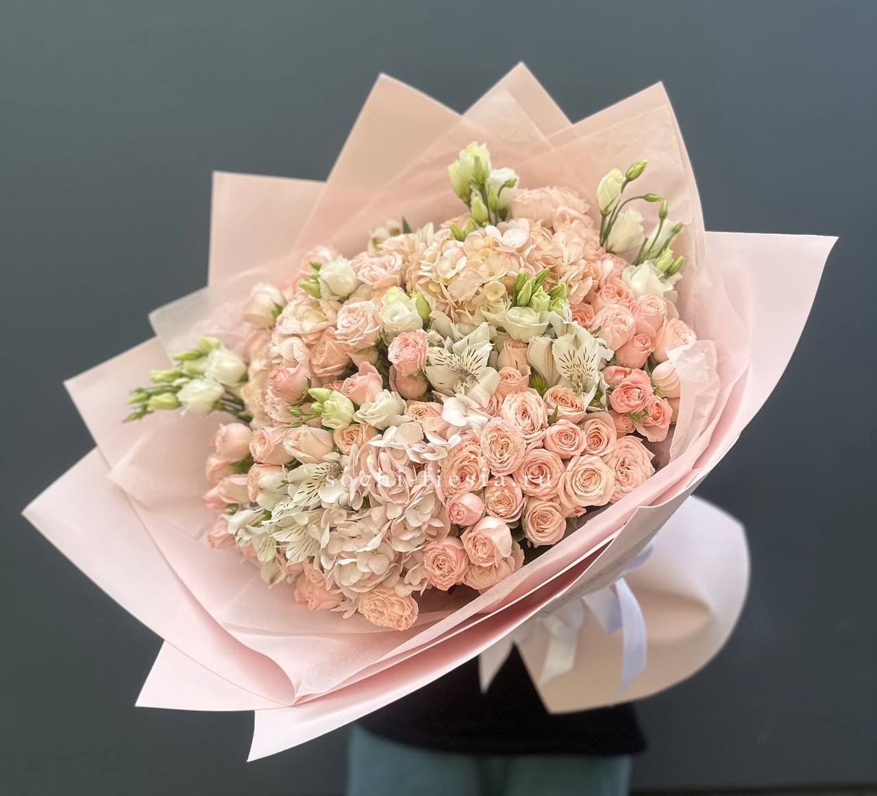 кустовые розы, эустомы, гортензии, альстромерии, лента и дизайнерская пленка.