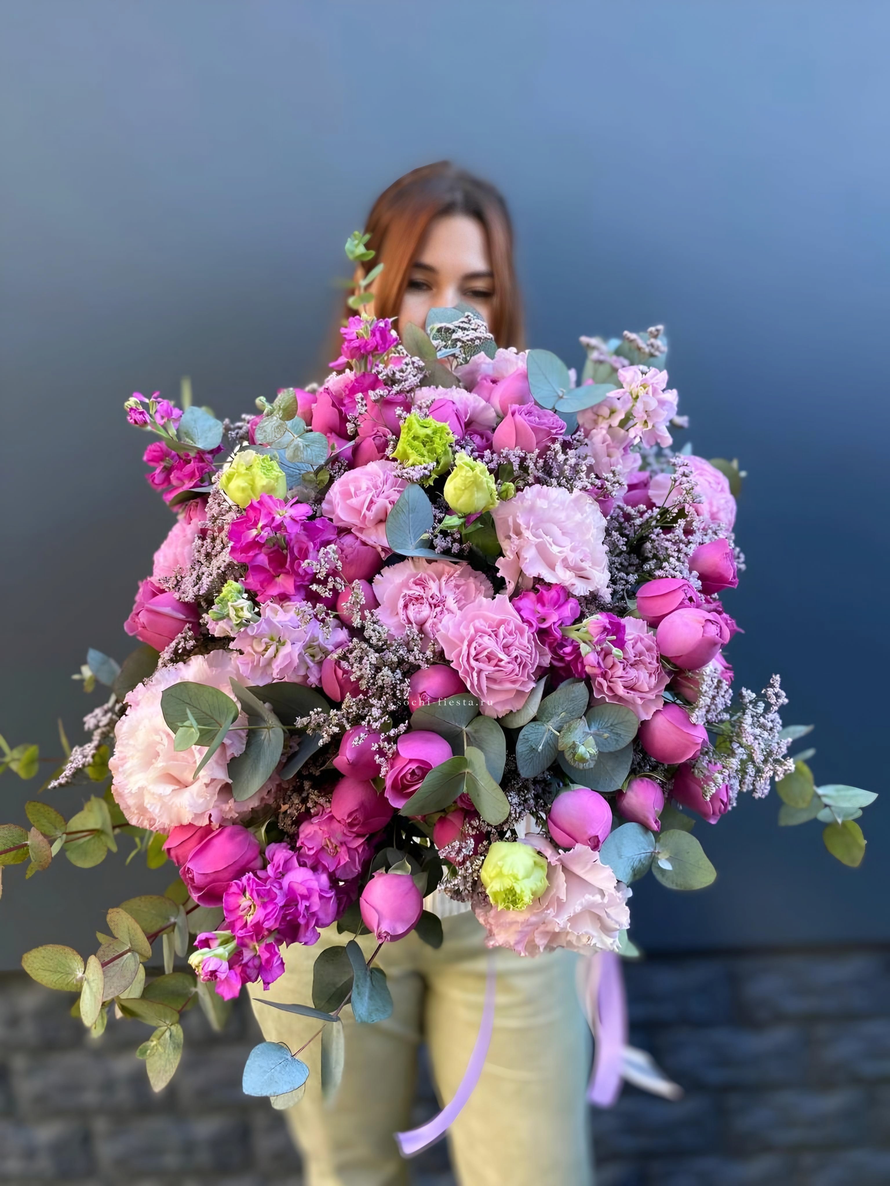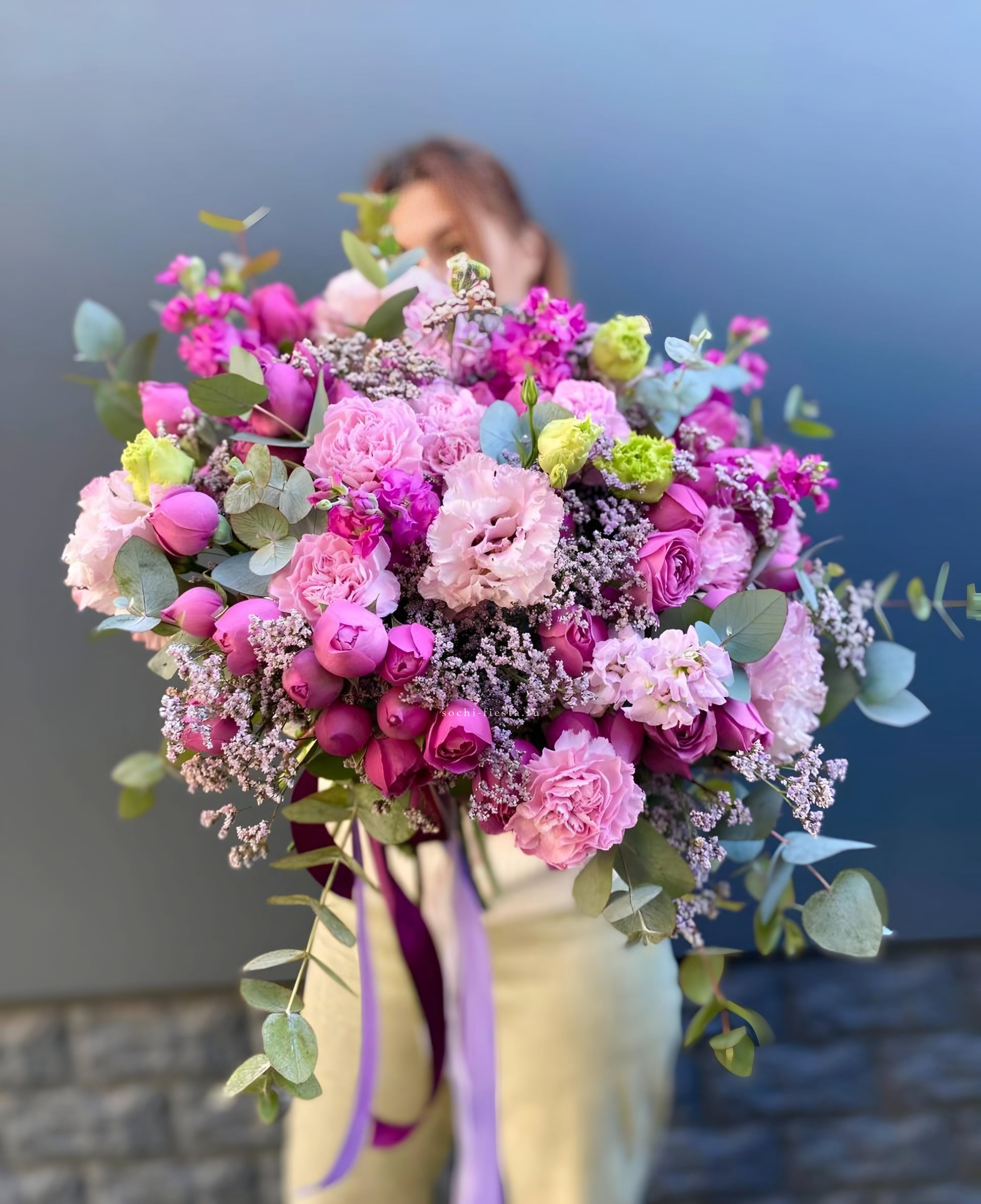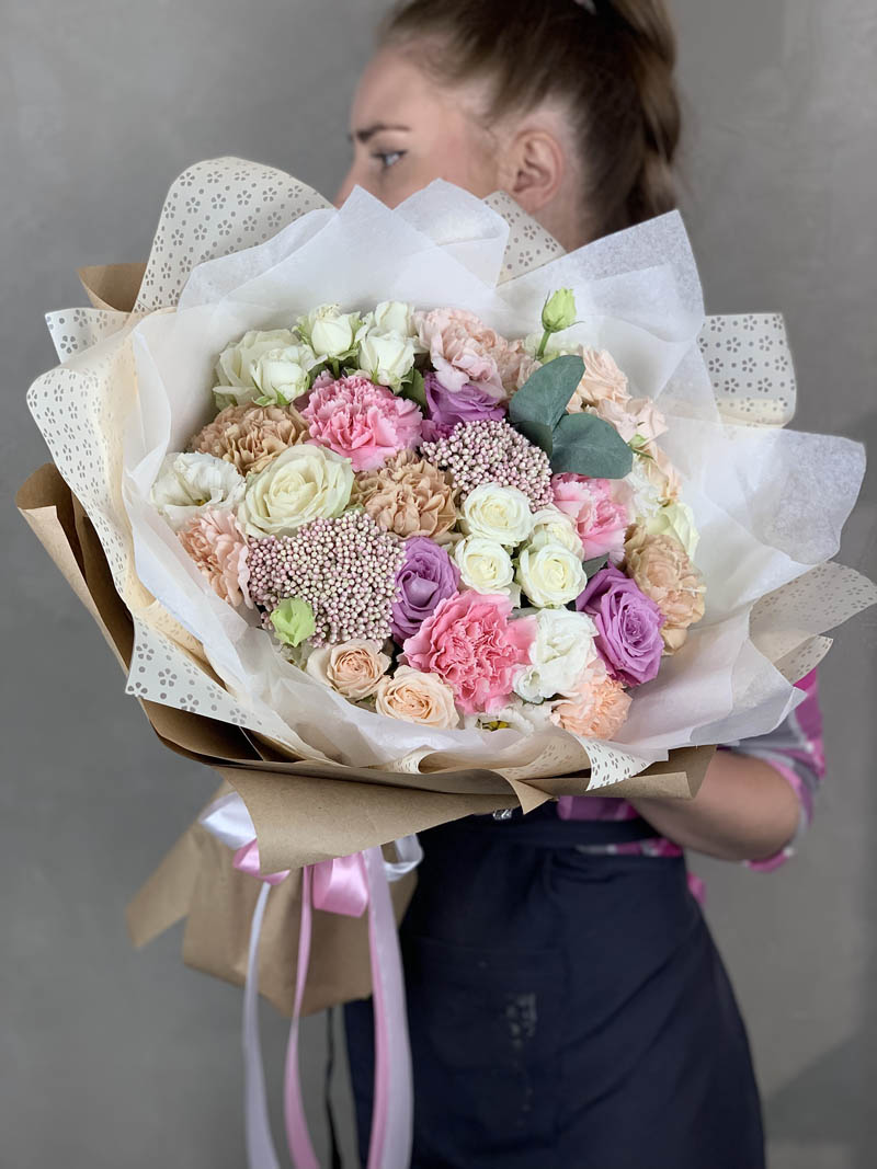 маттиола, диантусы, пионовидные розы Мисти Баблс, эвкалипт, лимониум, эустома лента, упаковка.