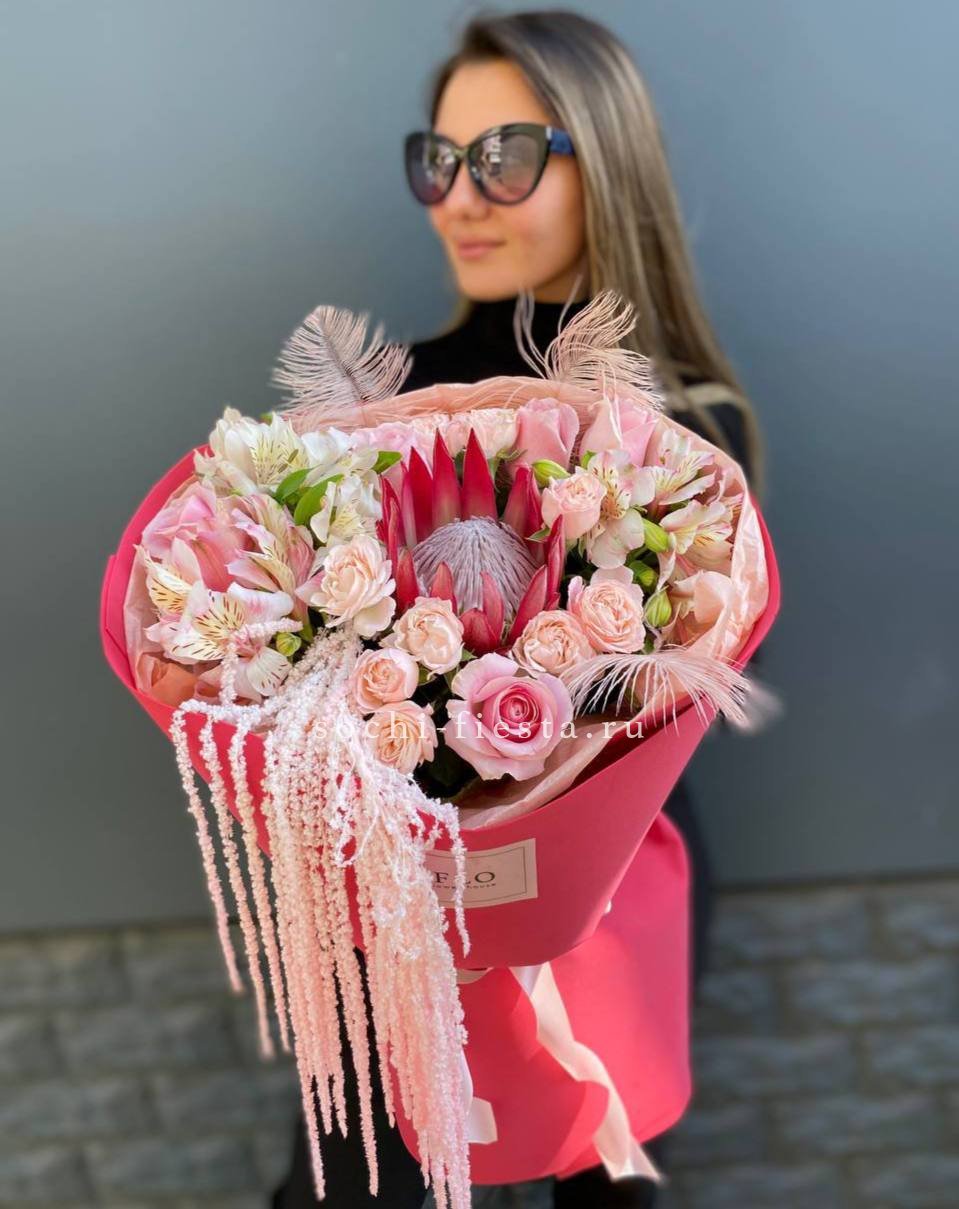 Протея и орхидеи задают графичный ритм, а пионовидные розы добавляют объём и мягкость линий. Гортензия создаёт плотную базу, на фоне которой каждый экзотический бутон читается ярче.