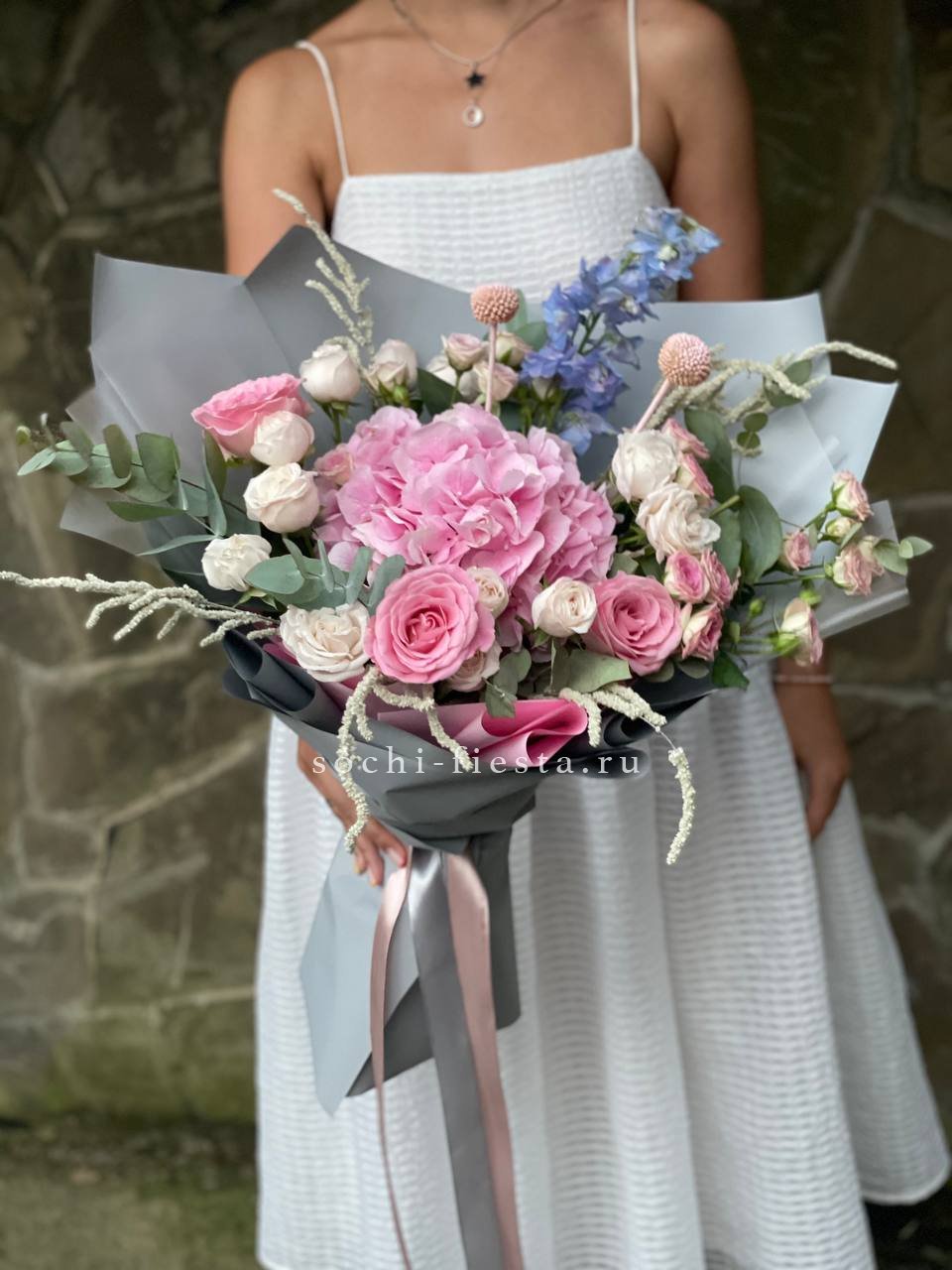 гортензия, пионовидные кустовые розы, орхидеи, нутан, протея, хамелациум, вспомогательная зелень, лента, дизайнерская упаковка.