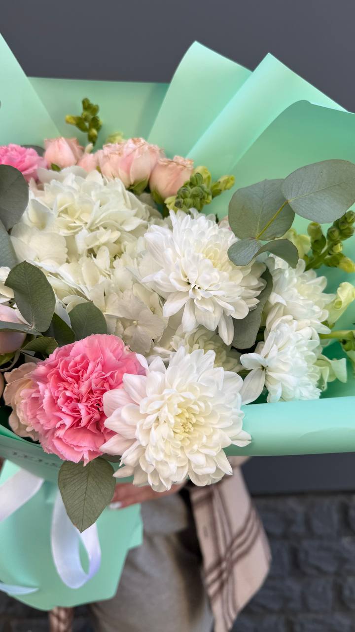 Диантусы и бигуди собраны в плотную форму с чёткими линиями. Эвкалипт задаёт вертикальный ритм и добавляет свежести. Композиция выглядит графично и современно.