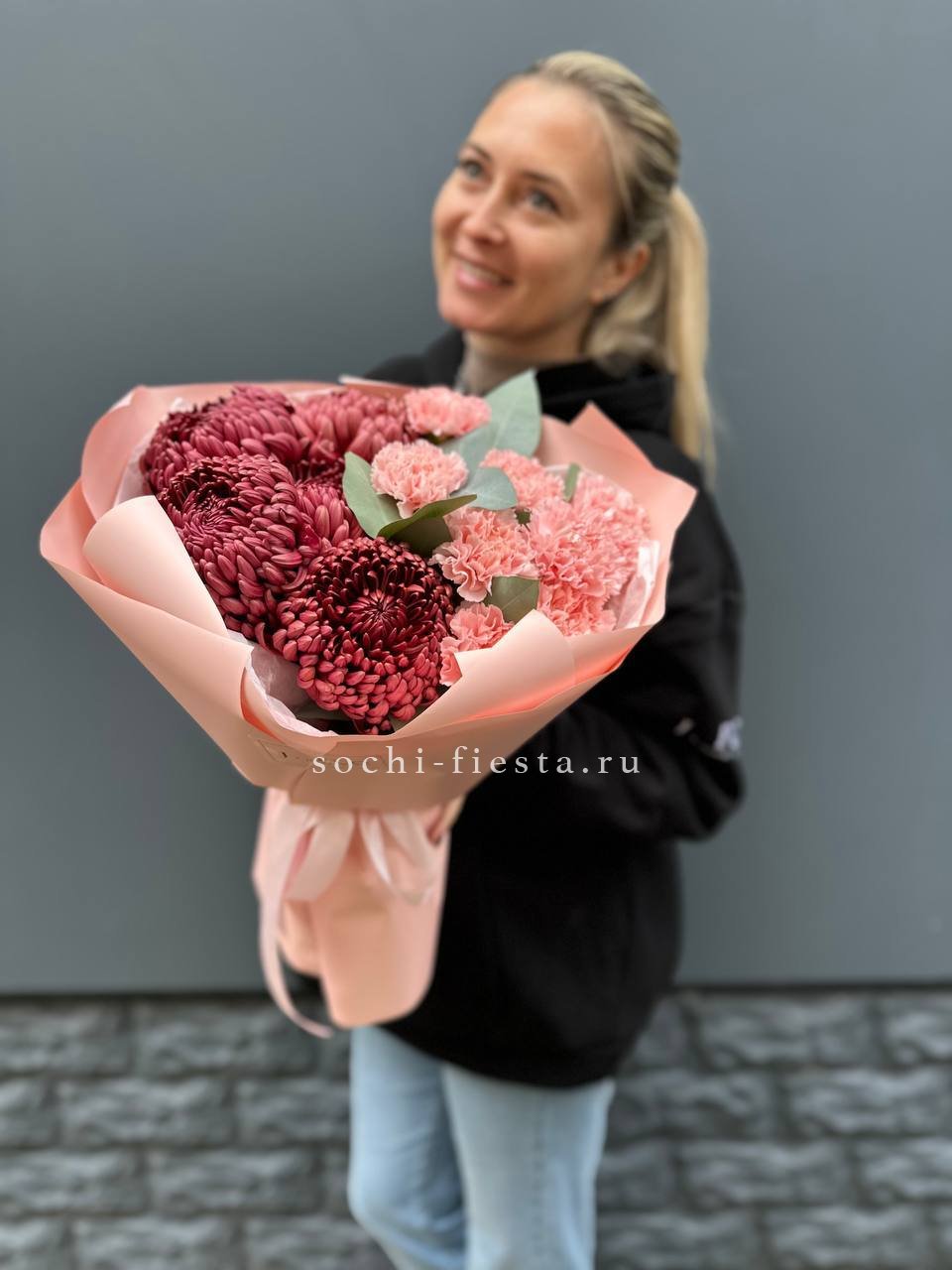 букет дуо диантусы и бигуди с эвкалиптом в оформлении.