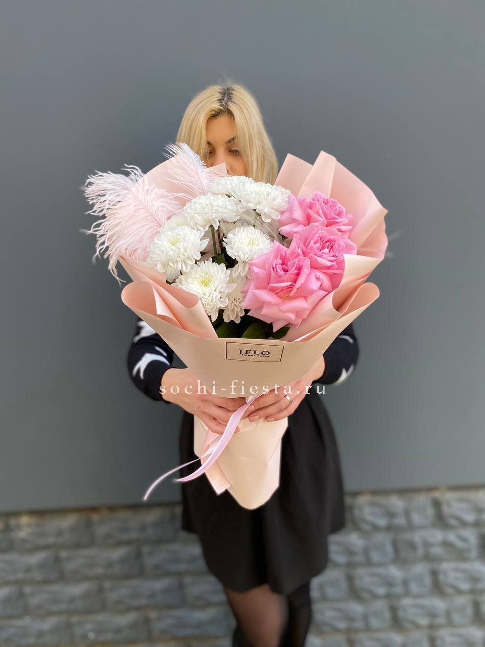 цветочная композиция с применением одноголовых хризантем, белых роз, озотамнуса или аналога, хлопка.