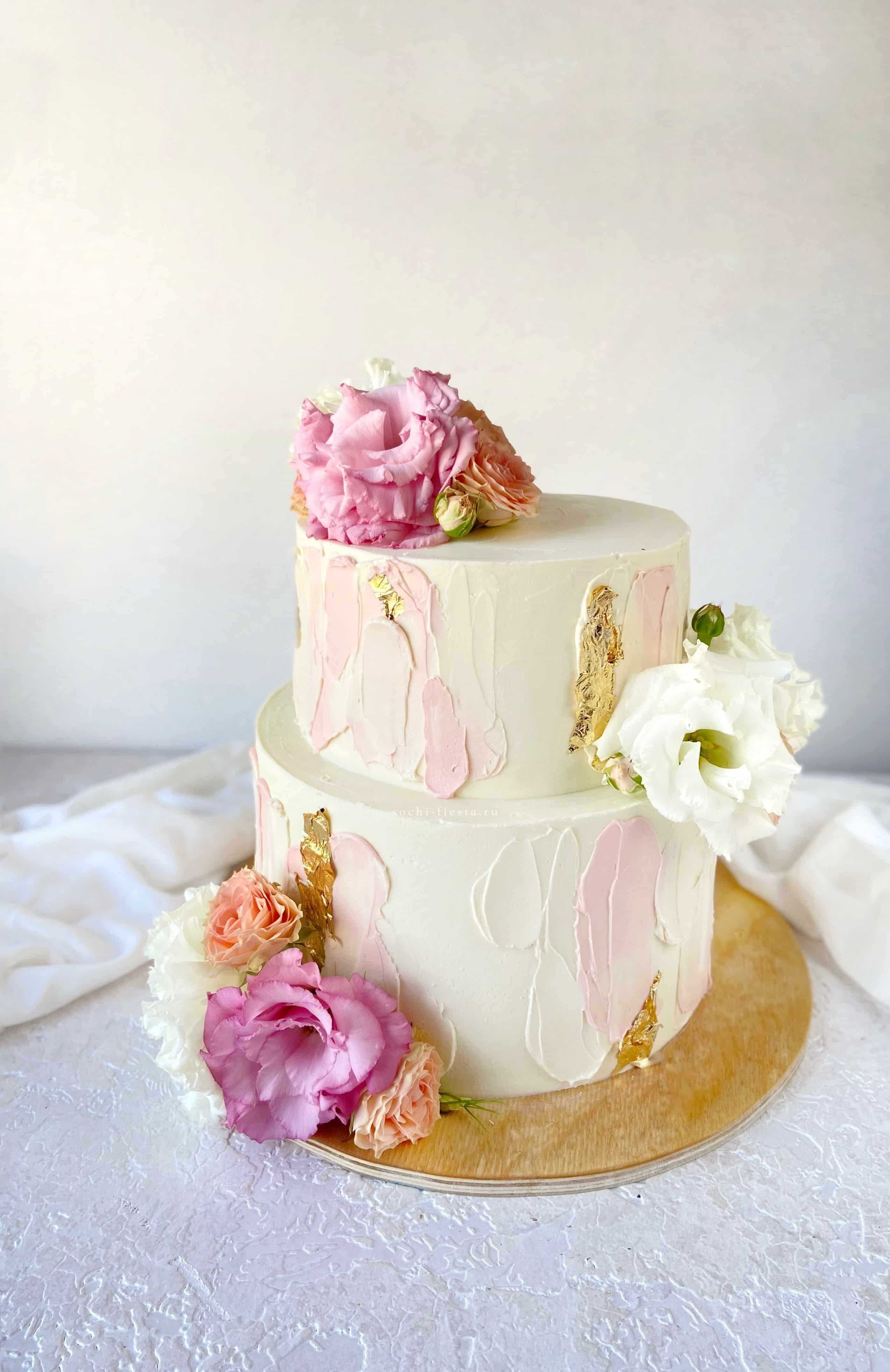 Двухъярусная конструкция с плавным переходом оттенков от пудрового к насыщенному розовому. Гладкая поверхность крема контрастирует с объемными цветочными деталями. Ручная работа с выбором начинки.