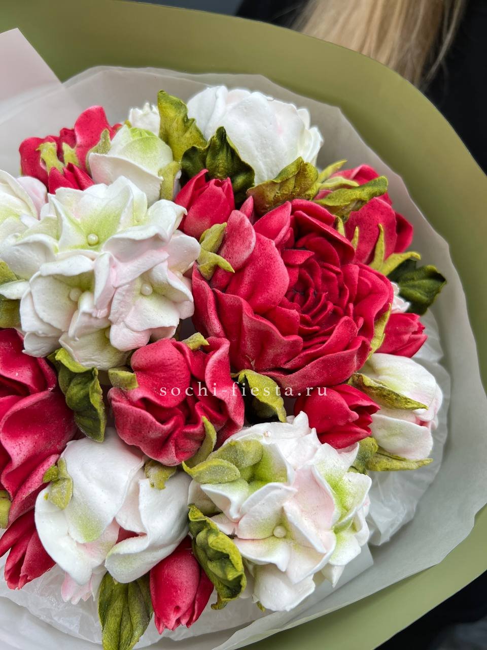 сахар, патока, пектин, агар, яблочное пюре, яичный белок, натуральный краситель, лимонная кислота. Цена за 1букет, размер S.